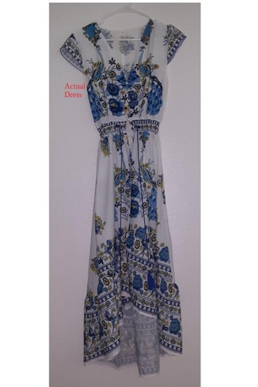 The models are wearing an all blue & white dress. The actual dress has slightly more color in it as shown in the additional pictures.