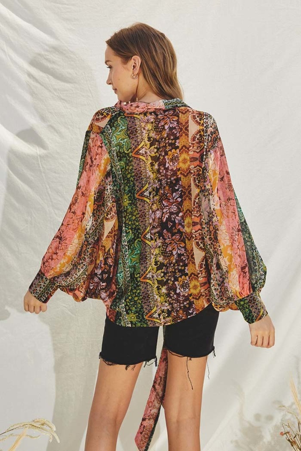 Paisley patchwork print kimono has a tie closure(front, side, or back) and long batwing sleeves. It is a relaxed fit. Unlined. Model is 5'10" and wearing size Small.