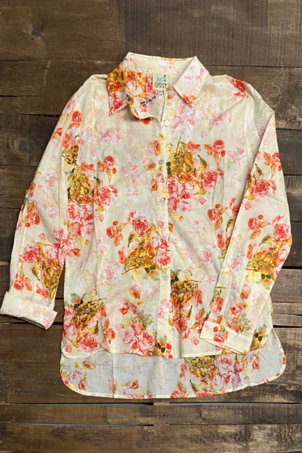 Let your inner flower child bloom wearing the Bonita Peaceful Gardens Top from Jaded Gypsy! This oversized collared shirt features a vibrant vintage floral print and an iconic peace sign graphic on the back. Crafted in 100% prewashed cotton, you'll be stylishly comfortable wherever your peace-filled journey takes you. Peace out, ladies!