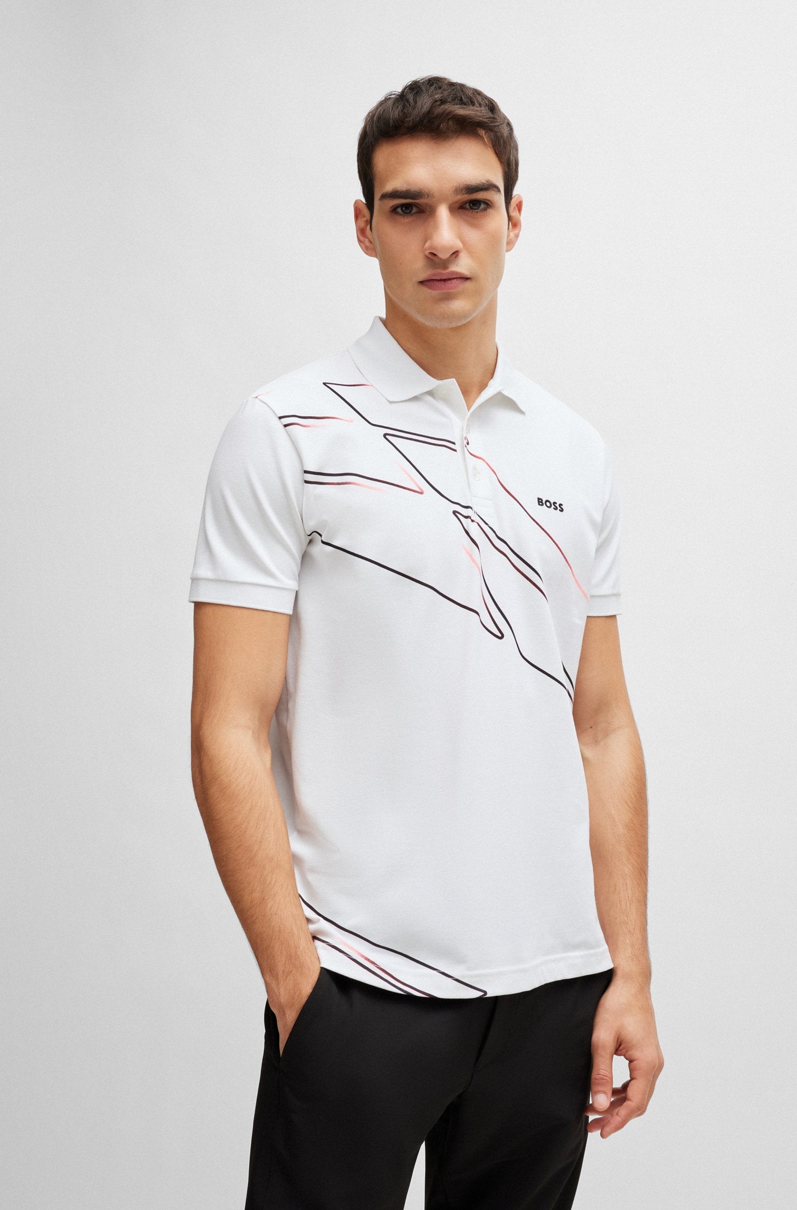 This BOSS Menswear polo shirt features a multi-functional design, crafted from quick-dry stretch-cotton with moisture control. It also boasts dynamic artwork and contrast branding for added style. The regular fit, flat-knit collar, 3 buttons, short sleeves, flat-knit cuffs, and standard length make this shirt a versatile and comfortable option for any occasion.