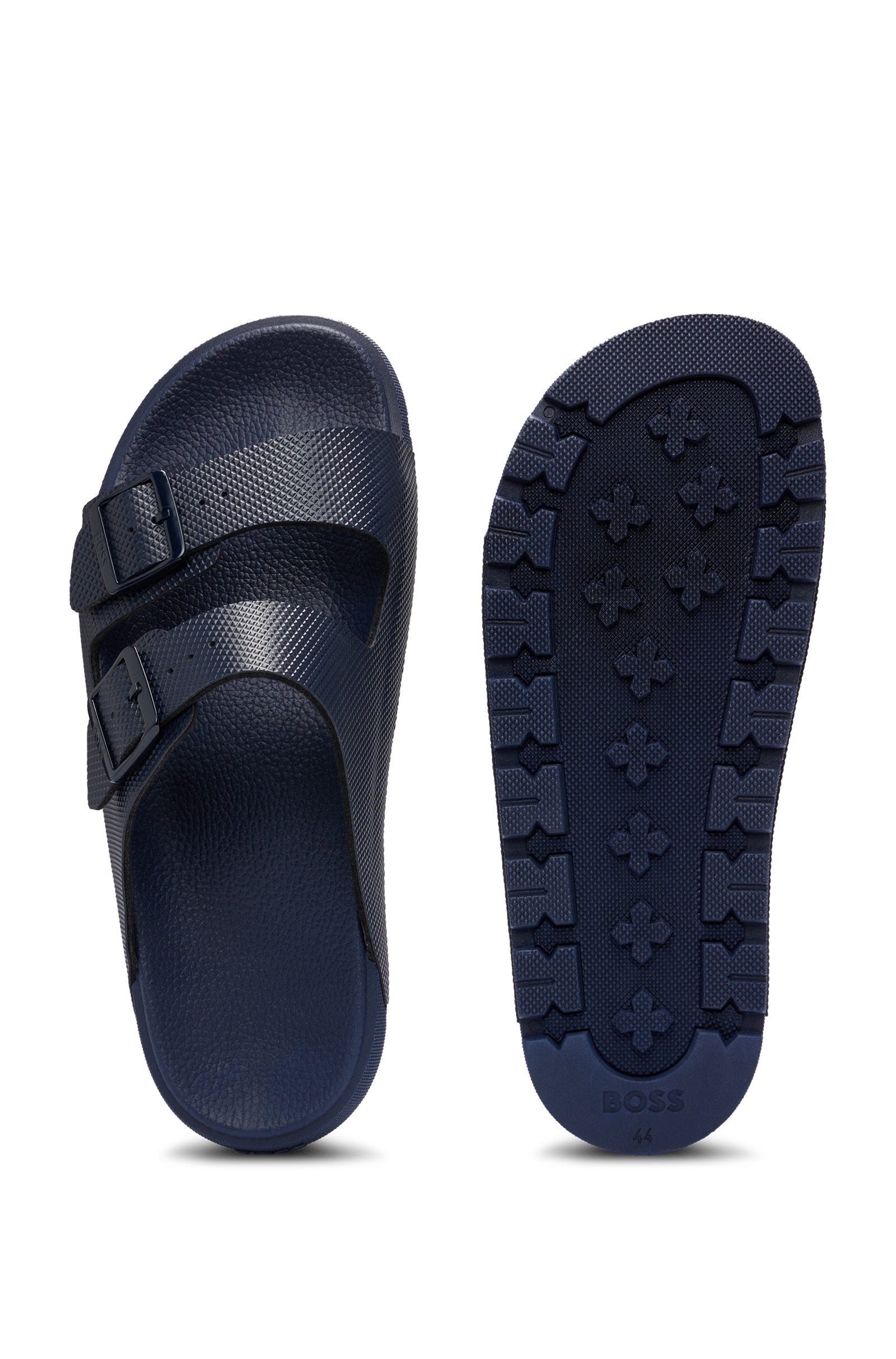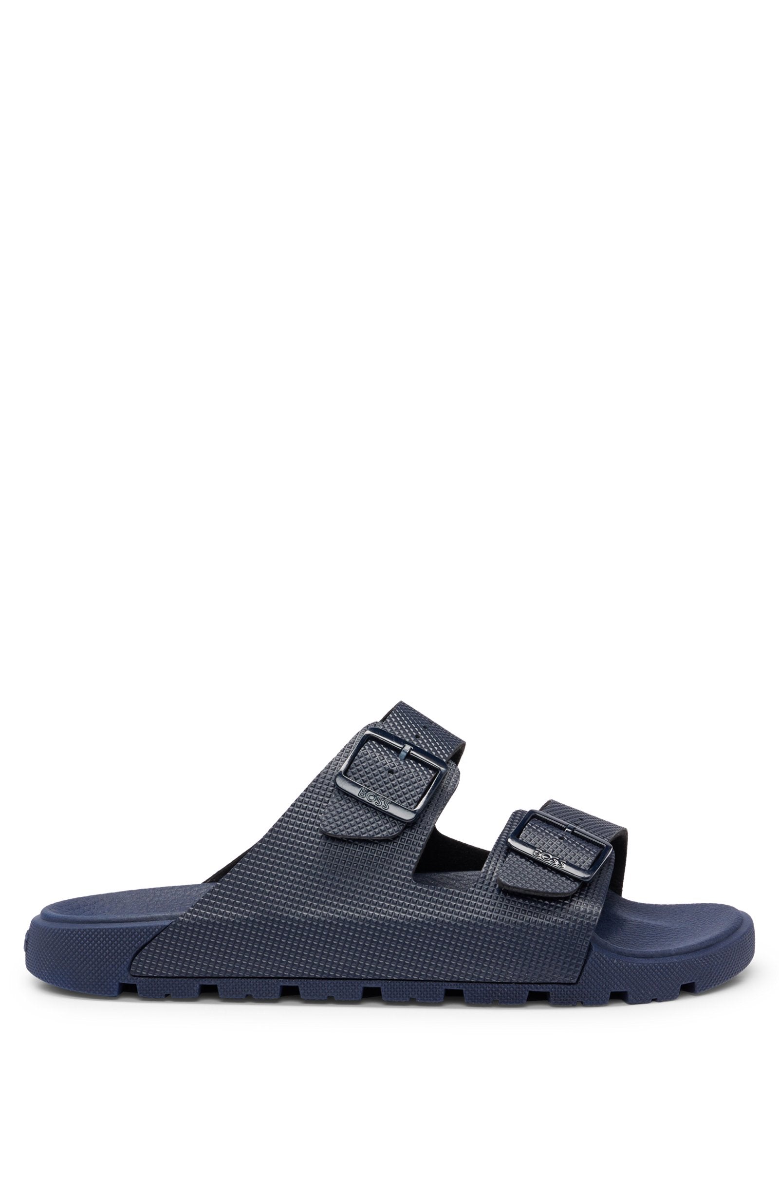 Expertly crafted with a structured rubberized material, BOSS Twin Strap Sandals feature a modern, all-gender design with double straps and branded buckles. The top fastening uses a buckle closure and they are partially lined for added comfort. Comes packaged in a box for secure transportation.