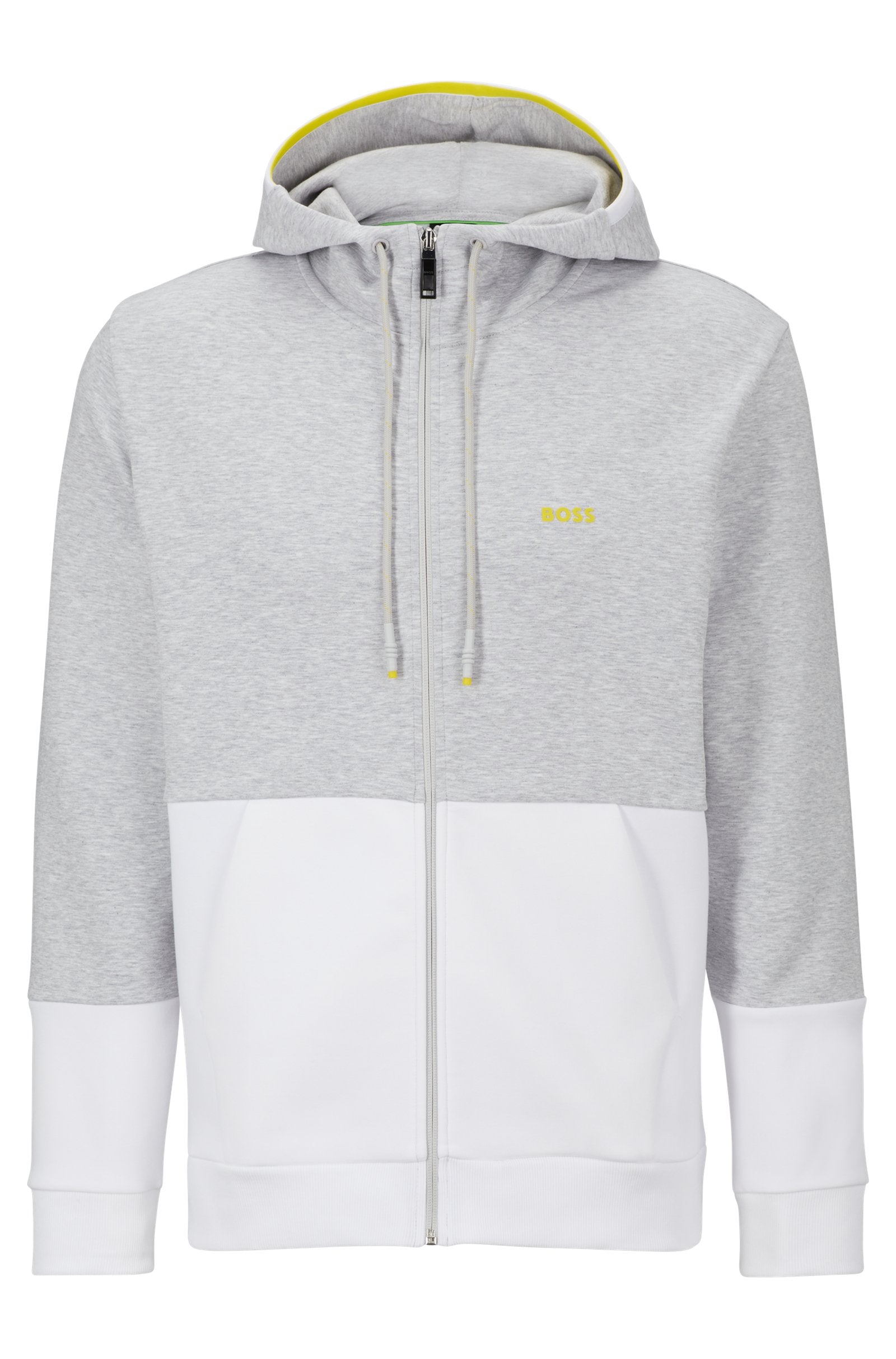 Feel the luxury of this BOSS Cotton-Blend Zip-up Hoodie. Finely crafted from a classic cotton-blend, this color-blocked hoodie features a regular fit for comfortable style. An embroidered logo adds sophisticated branding to this timeless piece - perfect for any stylish, discerning wardrobe.