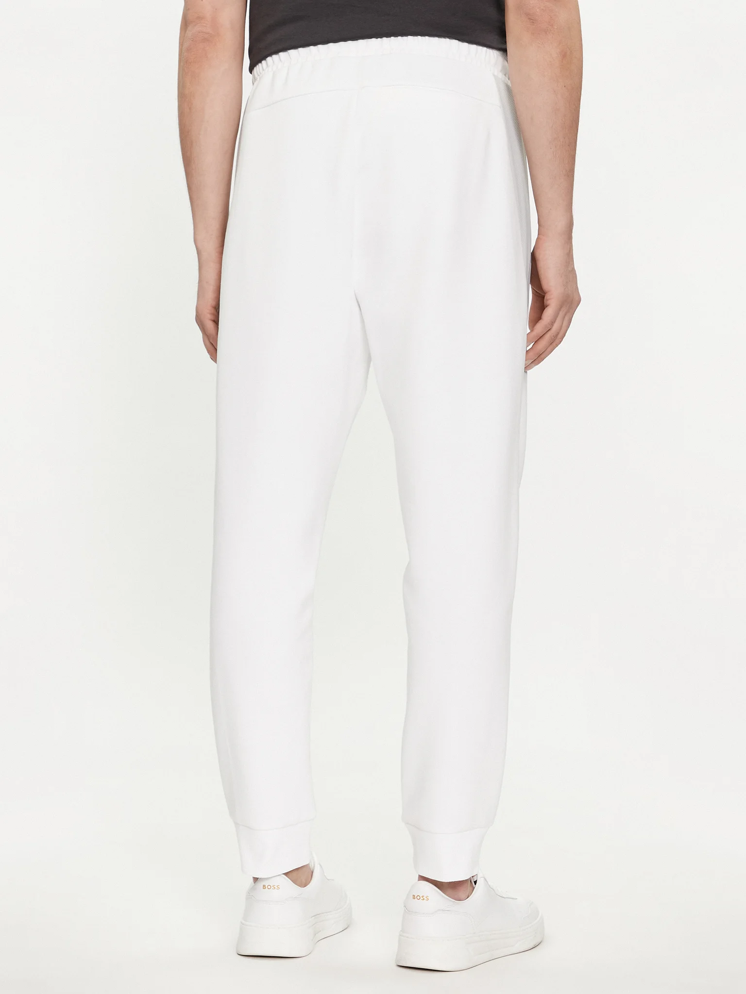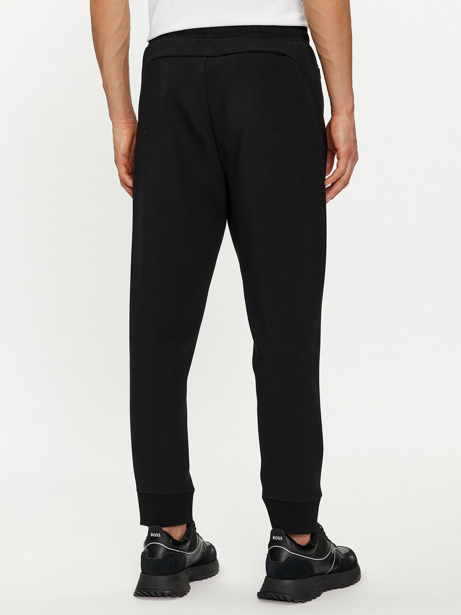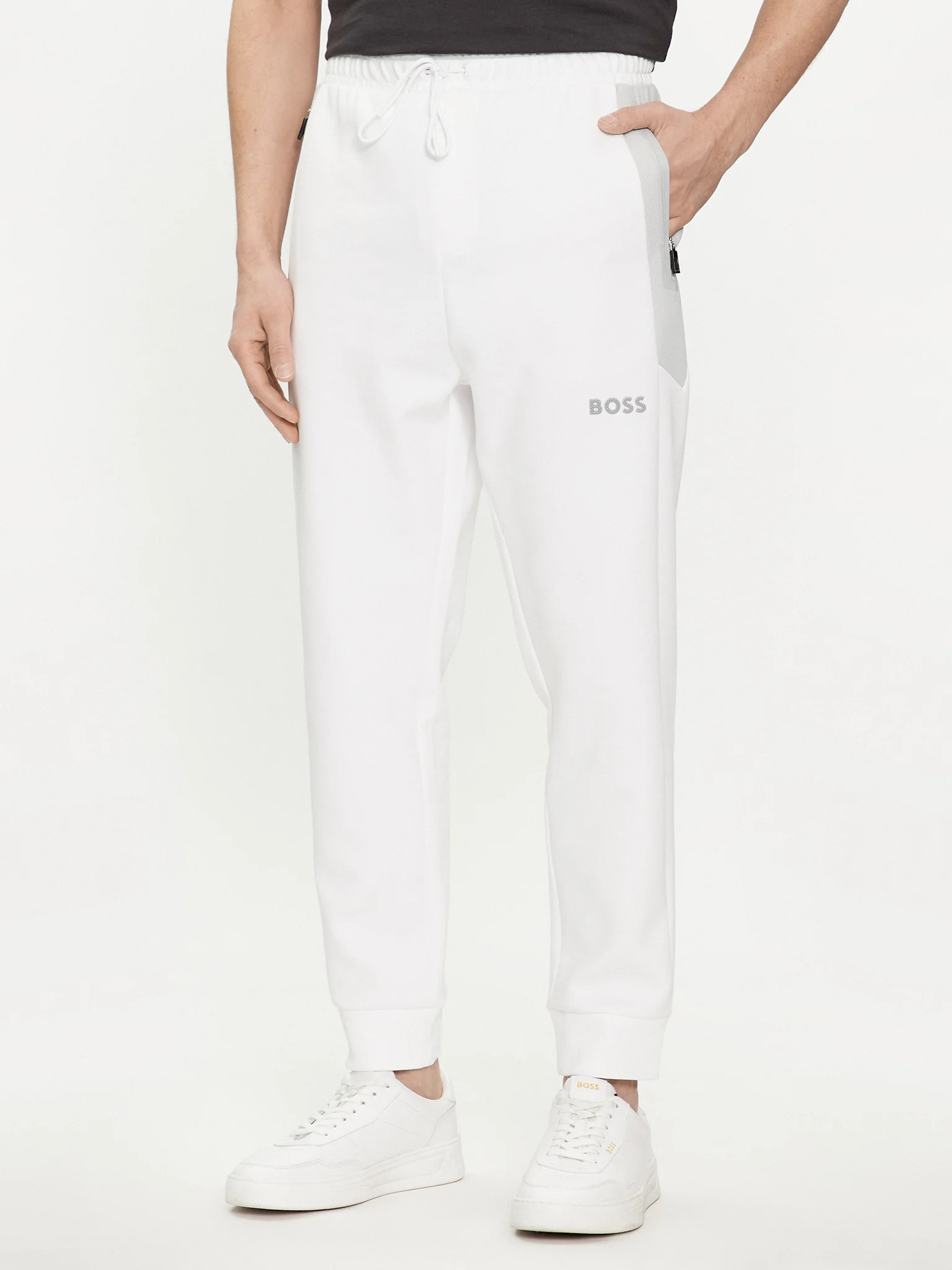 BOSS Menswear presents their sleek and modern Sporty Tracksuit Bottoms, designed for a straight fit in stretch fabric and featuring cuffed hems, 3D-molded logo, and breathable mesh trims. These bottoms also include convenient zip pockets in the front and jetted pockets in the back, all while maintaining a regular fit with an adjustable drawstring.