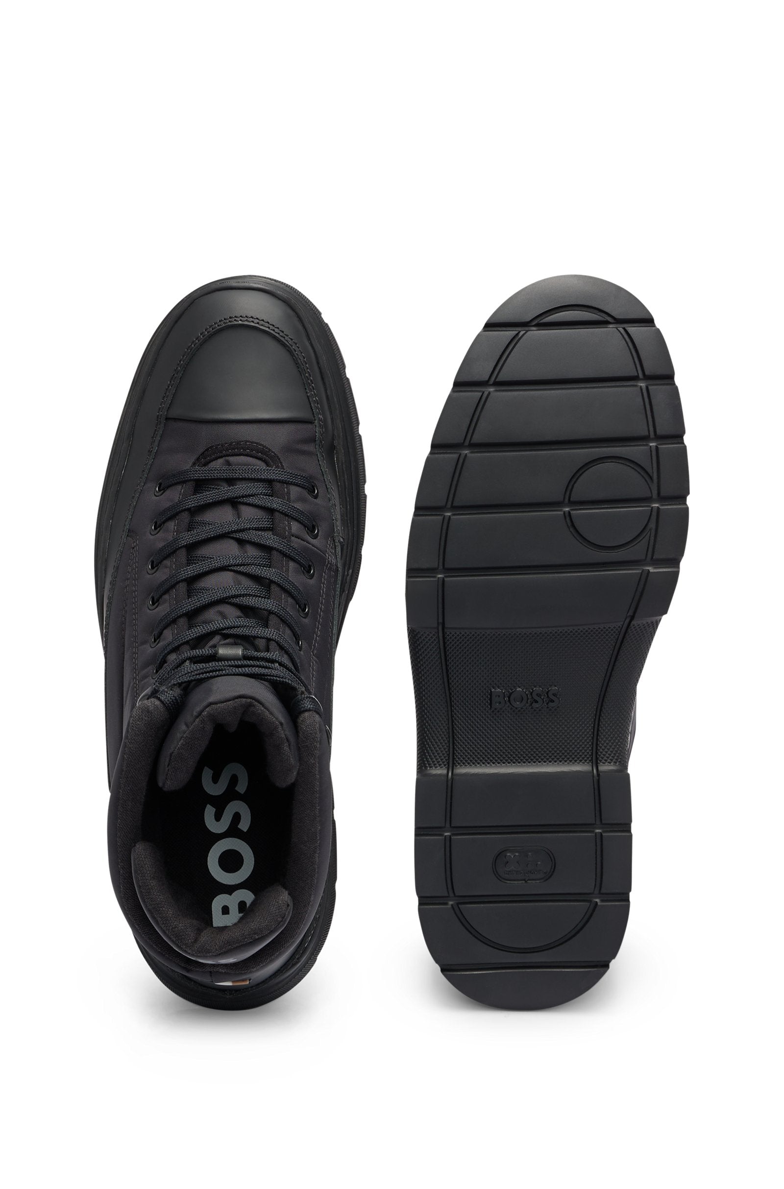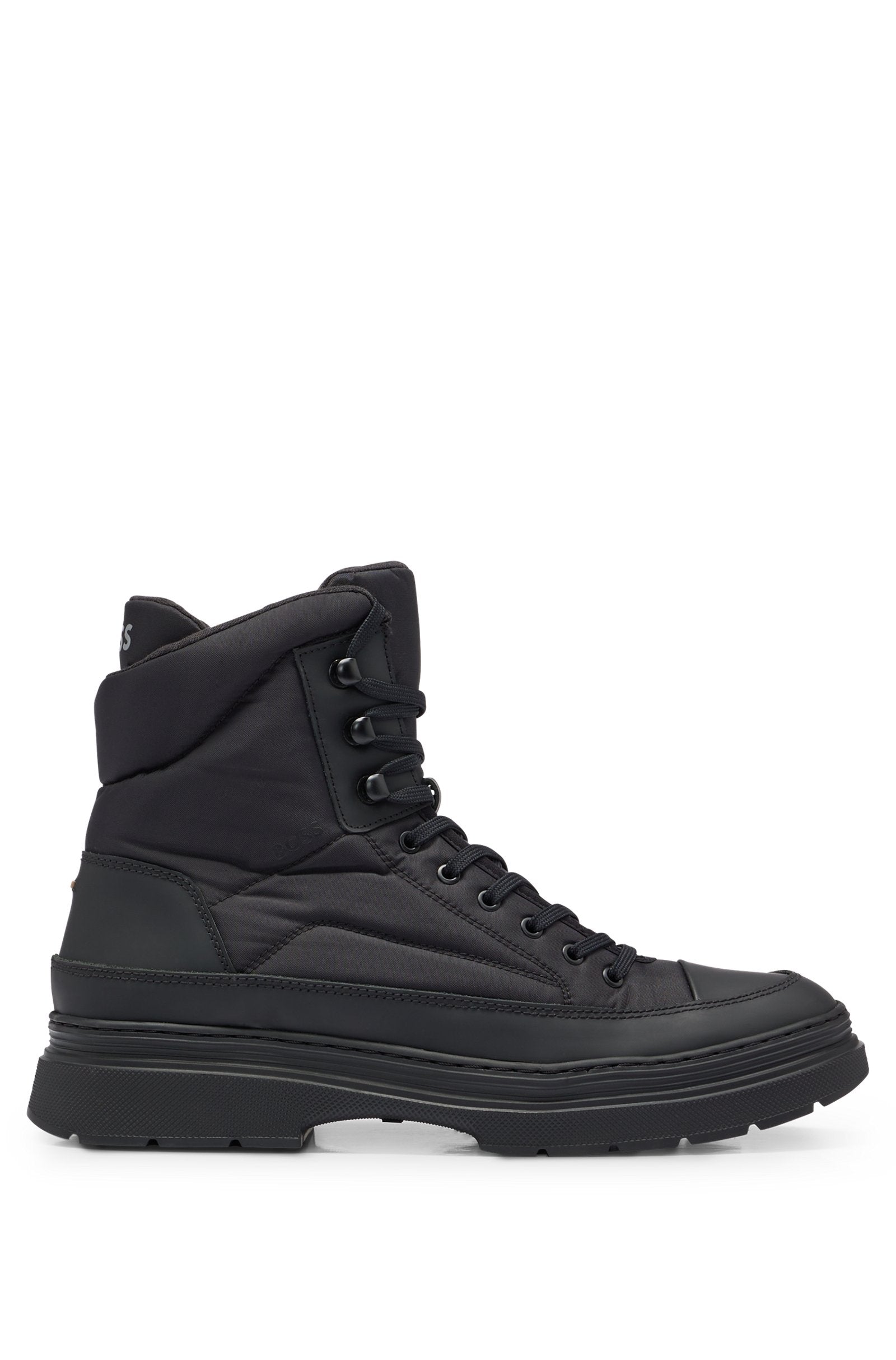 Stay stylish and dry in any weather with these hybrid low shoes from BOSS. Made of quilted fabric and rubberized leather, these sleek black boots feature a zip closure, drawstrings, eyelets with the iconic BOSS logo, and fully lined interiors.