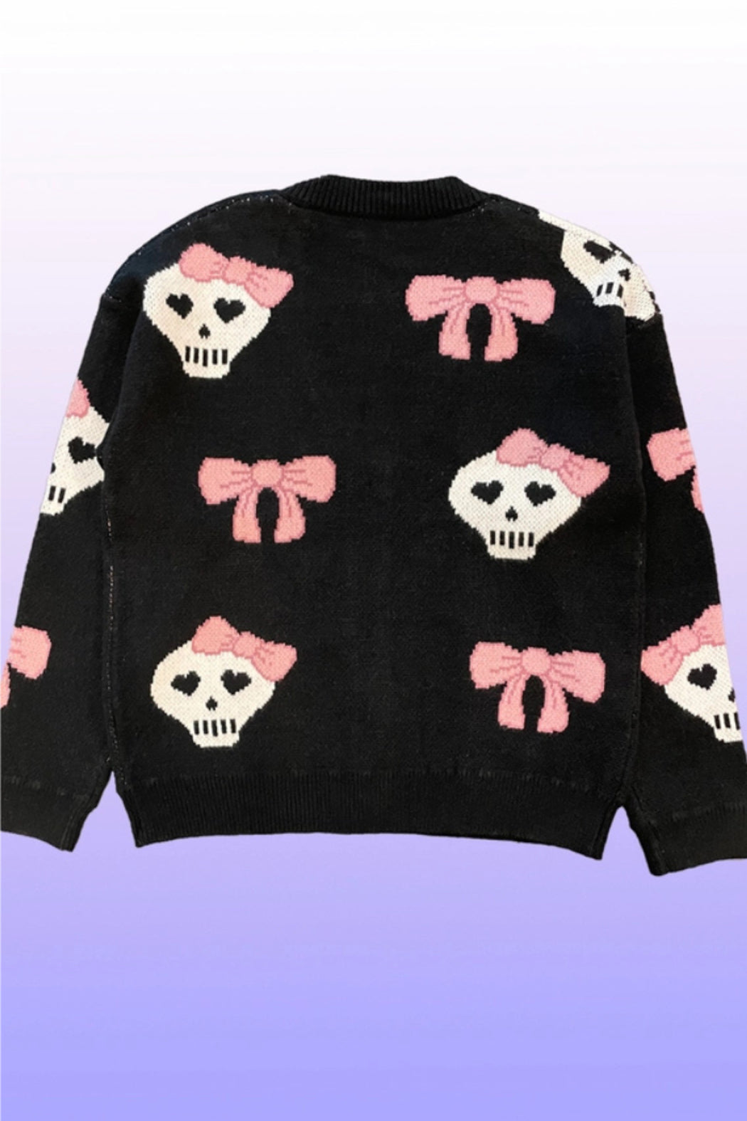The Bow Skull Knit Cardigan features a unique skull and bow intarsia design that adds personality to any look. Made from soft knit fabric, it has a button front and flattering V neckline. Wear the Bow Skull Knit Cardigan true to size or size up for a relaxed fit.