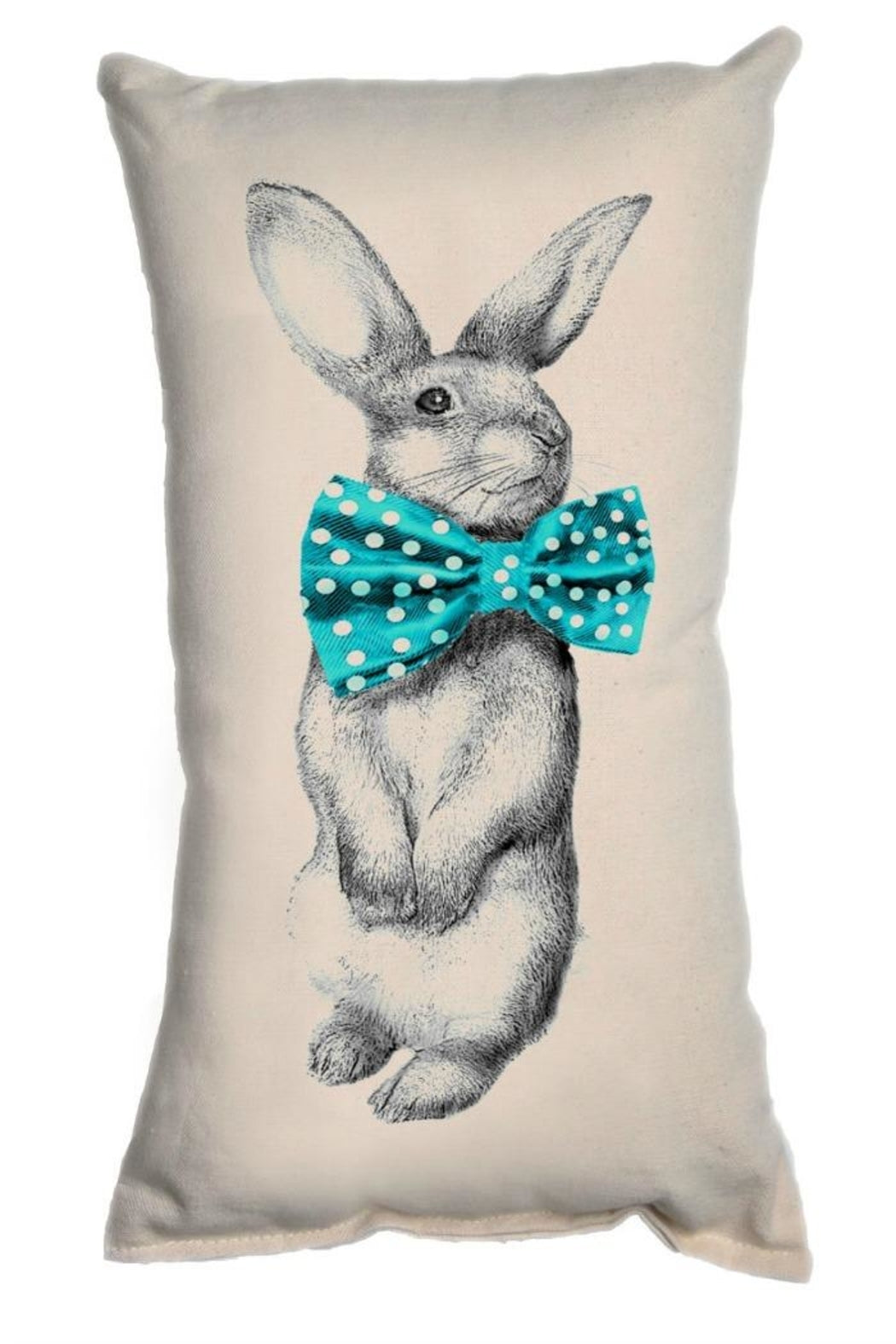 Bowtie Bunny Pillow-so adorable. A great gift! Or enjoy yourself. Size is 15" tall by 7" wide. Made of 100% canvas. Pillow is 100% Polyester. Screen printed and sewn in Bucks County, PA.USA