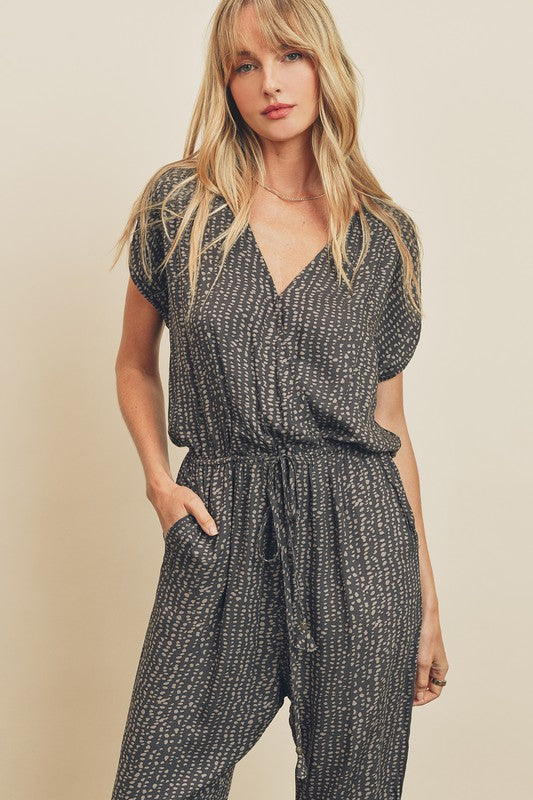 Light and dark gray abstract dot print. Set waist with tie belt. V-neck and snap closure. Low capped sleeve. Elastic cuff hits above ankle. Pockets! Lightweight.
