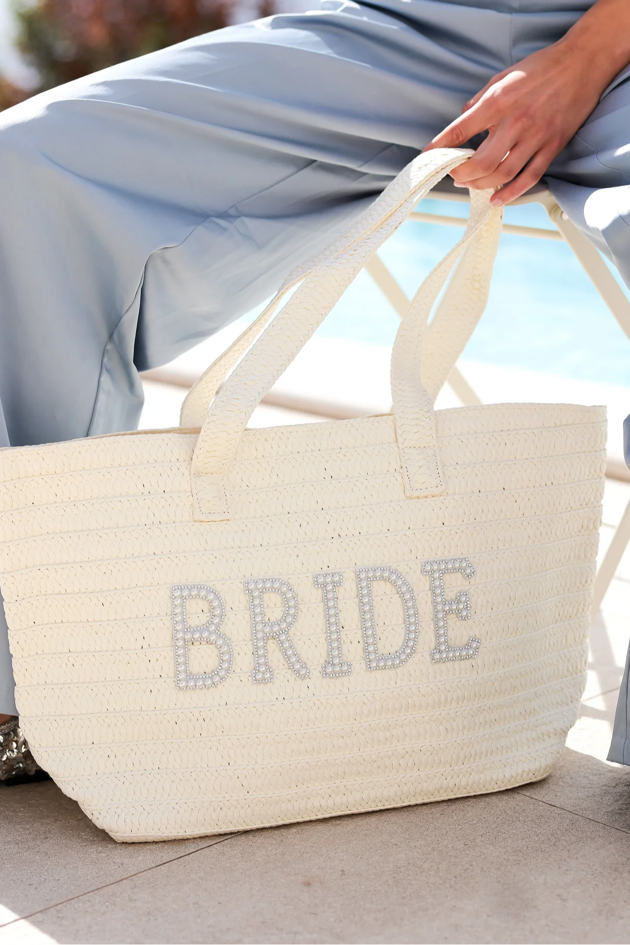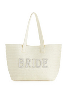 Say "I do" to the ultimate bridal accessory – the "Bride" Tote! Crafted in a chic, ivory woven design with faux pearl lettering, this spacious bag features dazzling pearl-embellished lettering that ensures everyone knows you’re the star of the show. Whether you’re toting it to pre-wedding brunches, bridal showers, or jetting off to your honeymoon, it’s the perfect blend of elegance and practicality. Lightweight, roomy, and oh-so-pretty, this tote is your bridal must-have for all things wedding-related. Pair with other items from our Collection to complete your bridal look!