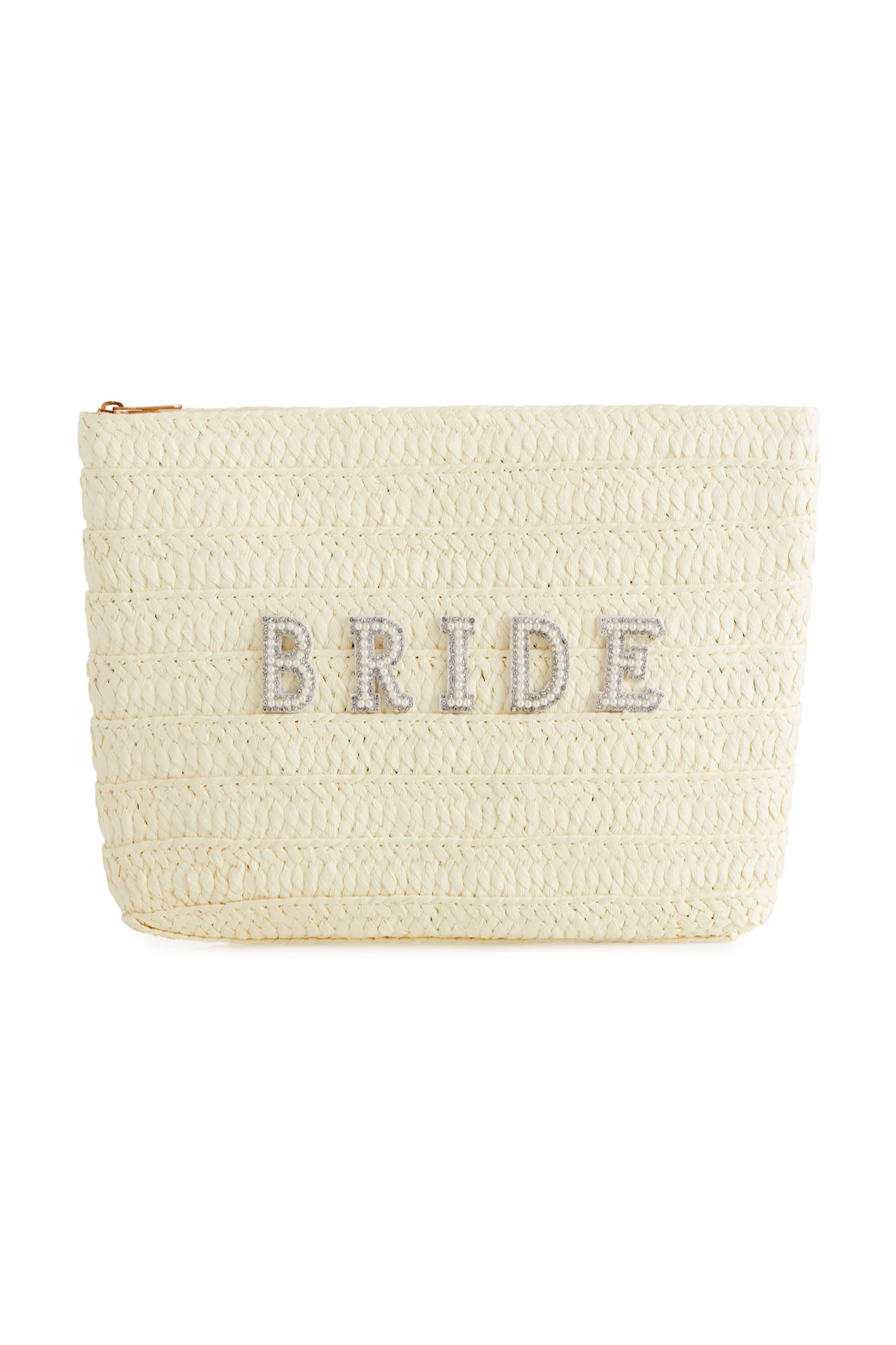 Meet the "Bride" Zip Pouch – the perfect companion for the big day (and every moment leading up to it)! Crafted in a chic woven texture, this elegant pouch features sparkling rhinestone letters that spell out BRIDE, making it a must-have for bachelorette trips, bridal showers, or honeymoon adventures. Spacious yet lightweight, it keeps all your wedding essentials – from touch-up makeup to love notes – perfectly organized. The creamy ivory hue adds a timeless, sophisticated touch that complements every bridal look! Pair with other items from our bridal Collection to complete yours!