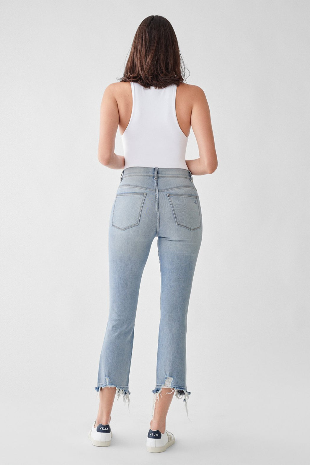 Wyndham is a light, bright blue with sanding through out the leg and a released, destructed hem.