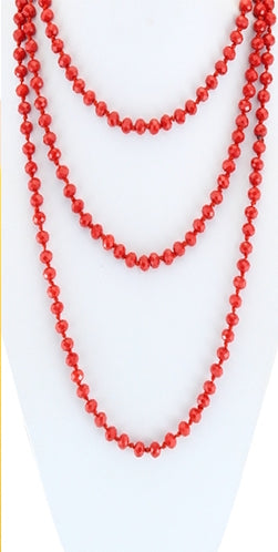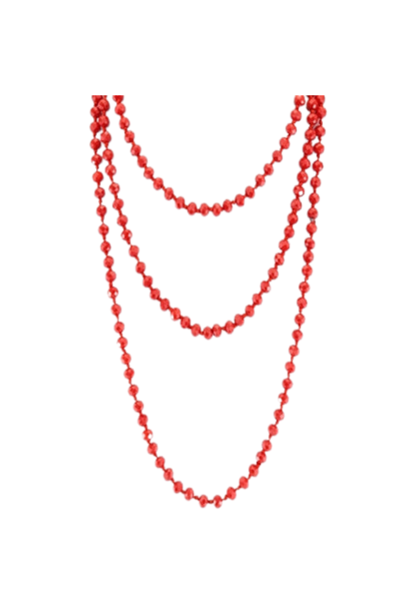 Long necklace beaded with bright red crystals with decorative knots used to space out each bead.
