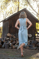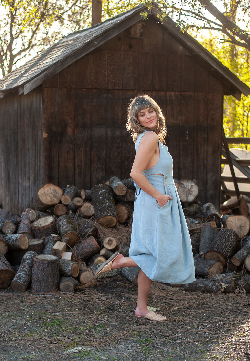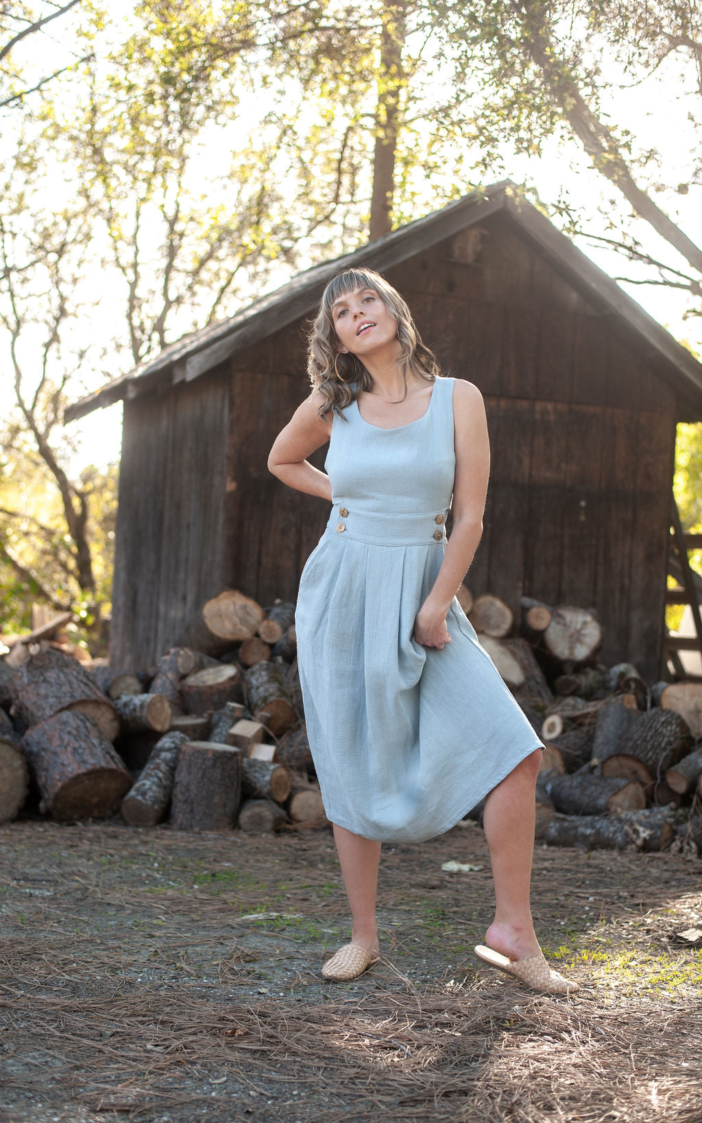Made from a deadstock textured cotton fabric in a bb blue that is lightweight and opaque.