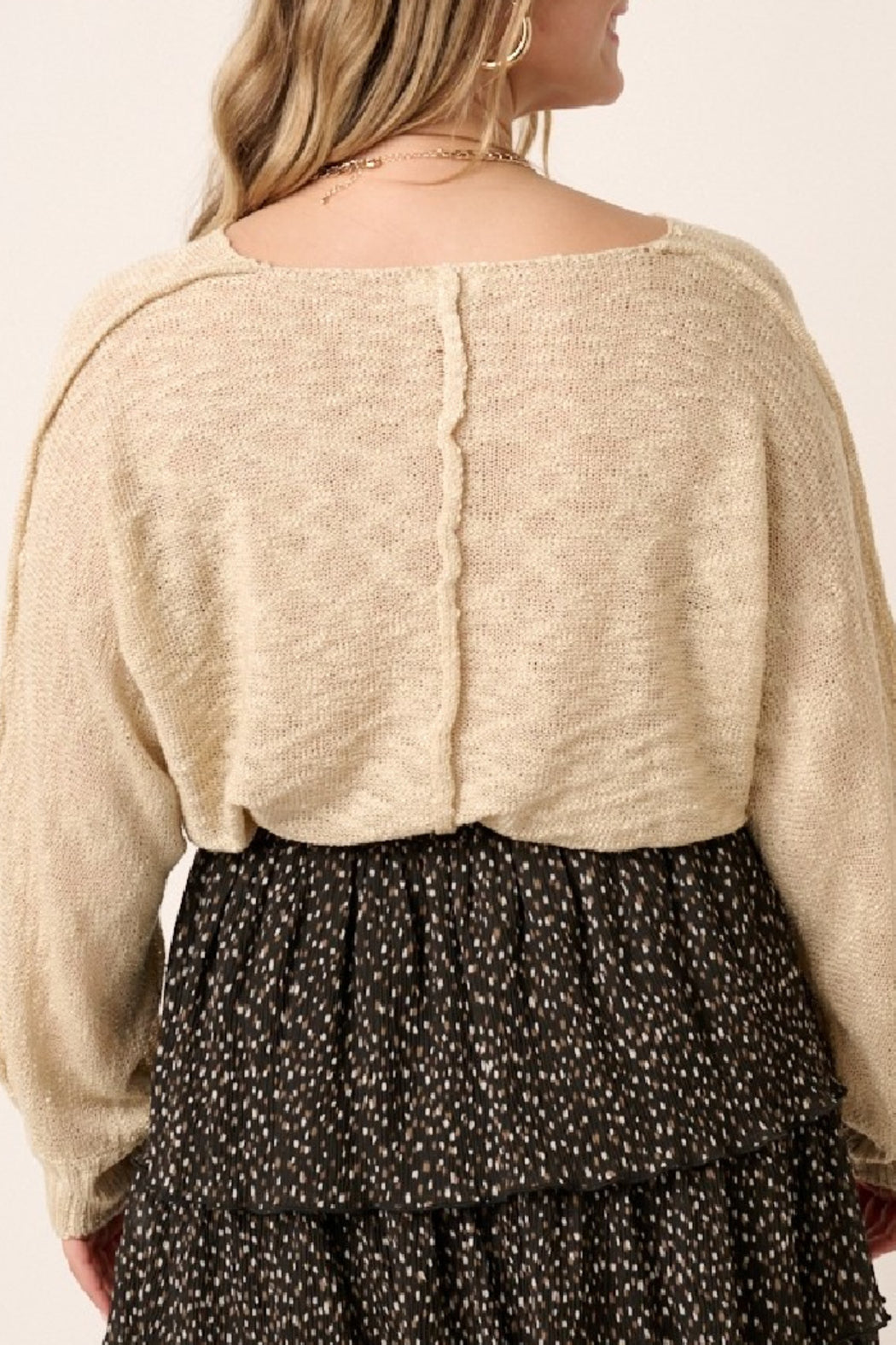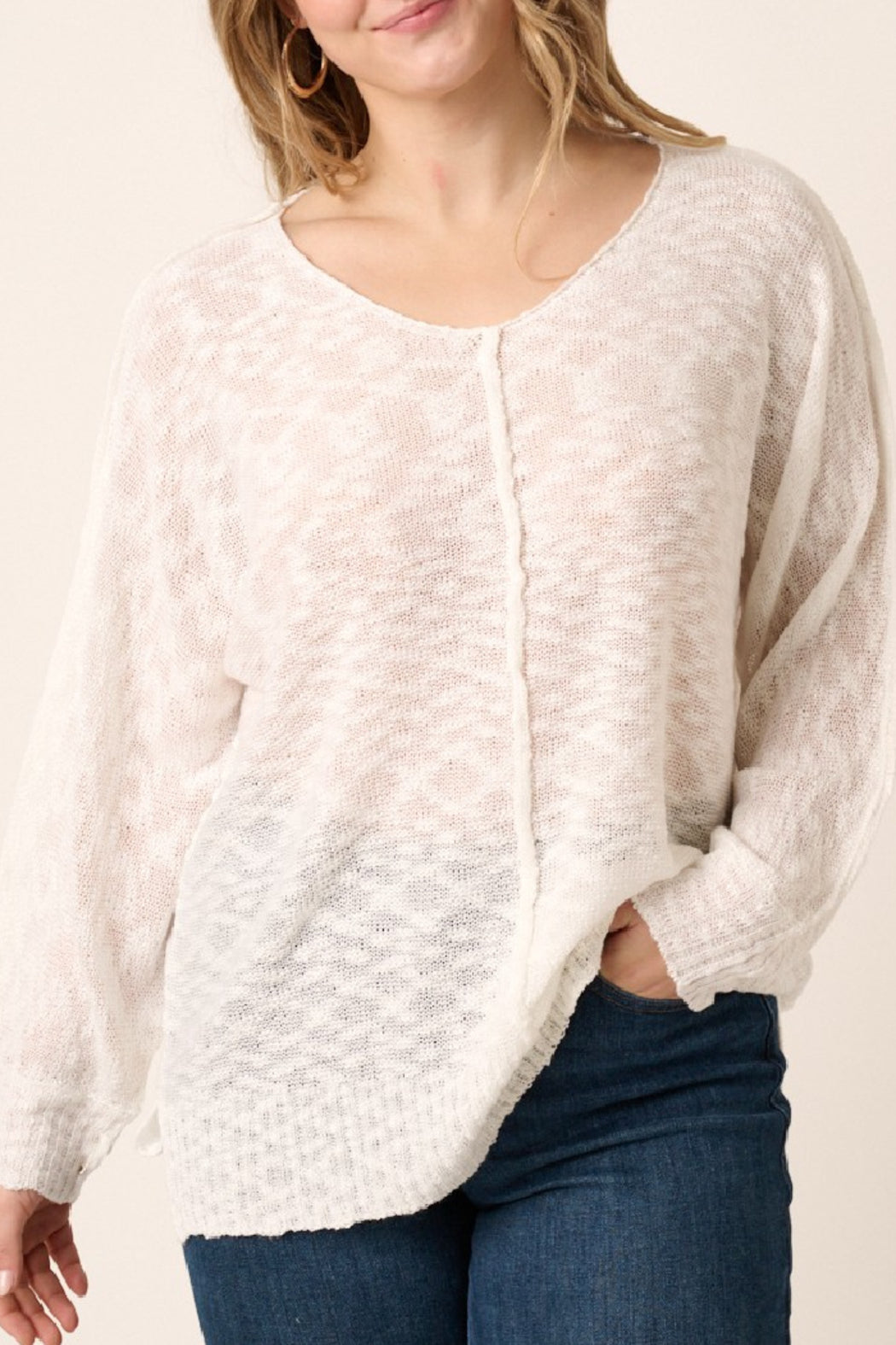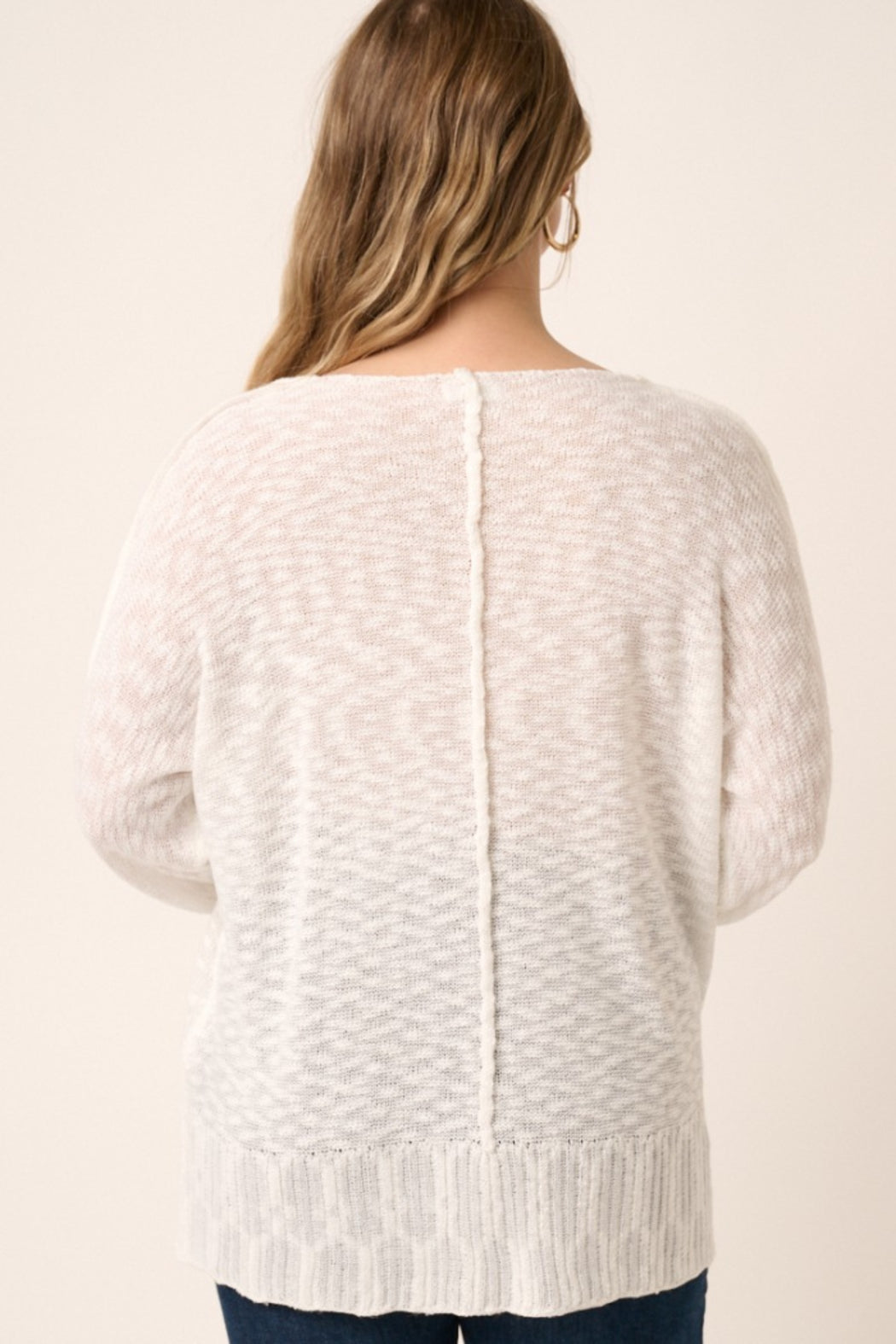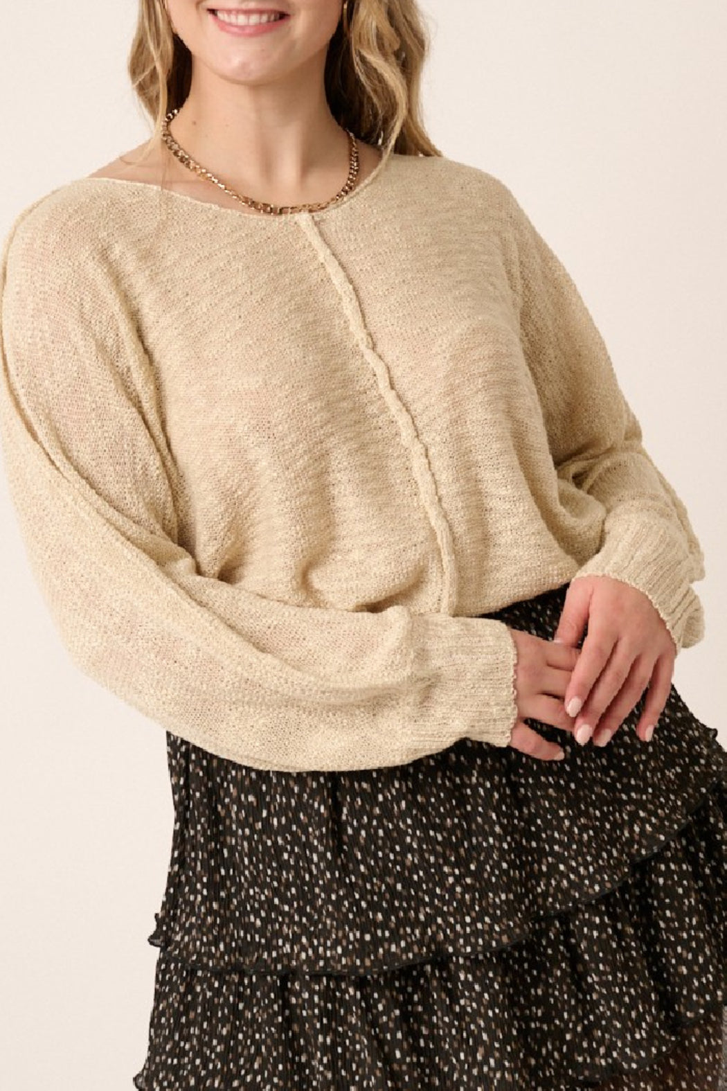 Long sleeve light weigh, loose knit pullover top with ribbed hem and cuff detail. Slight high low hem and side splits. Oversized fit. Model is wearing a size XL. Refer to measurements for your perfect fit. Across chest measurements; XL 25", 1XL 26", 2XL 27". Shoulder to hem; XL 27.5", 1XL 28", 2XL 28.5".