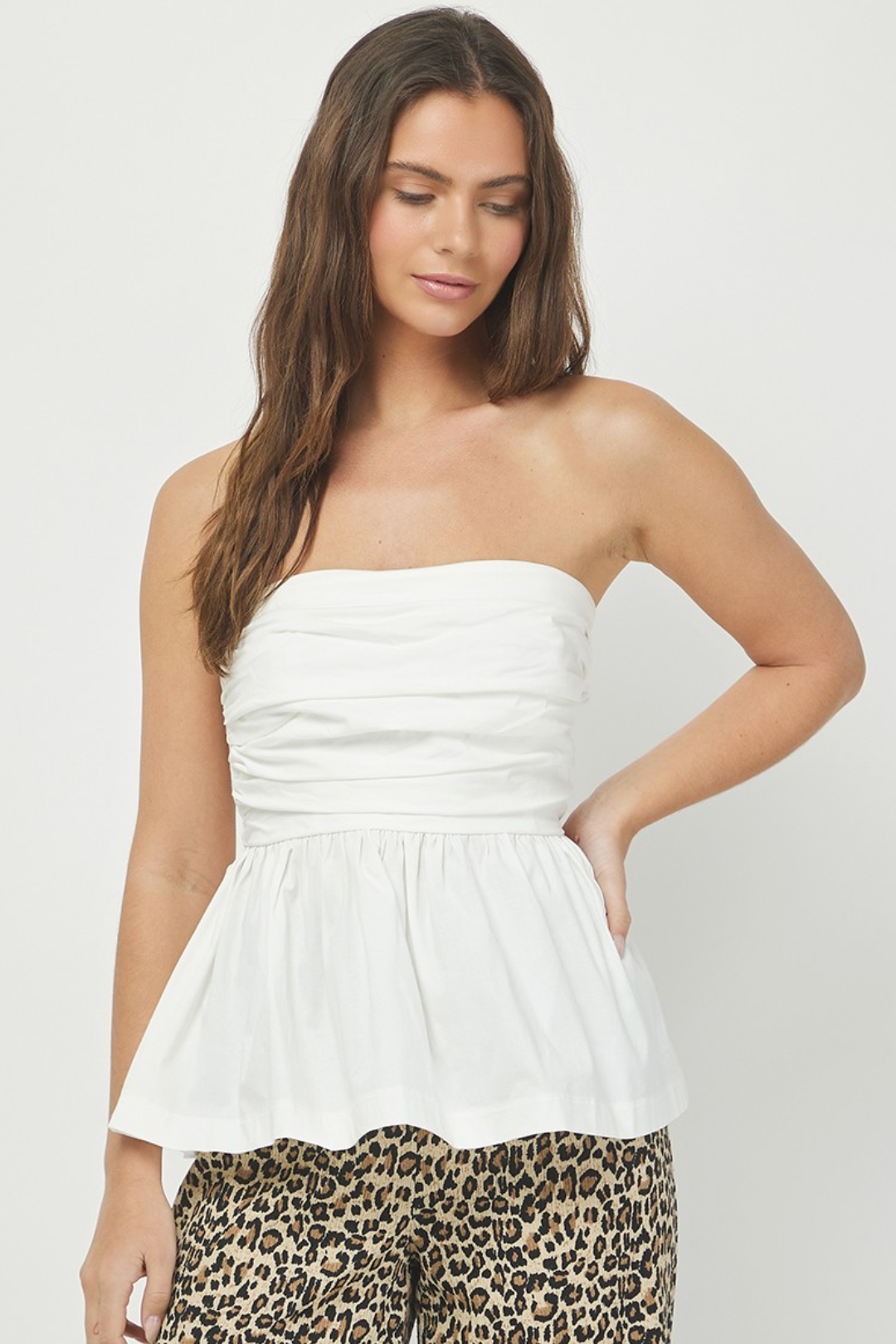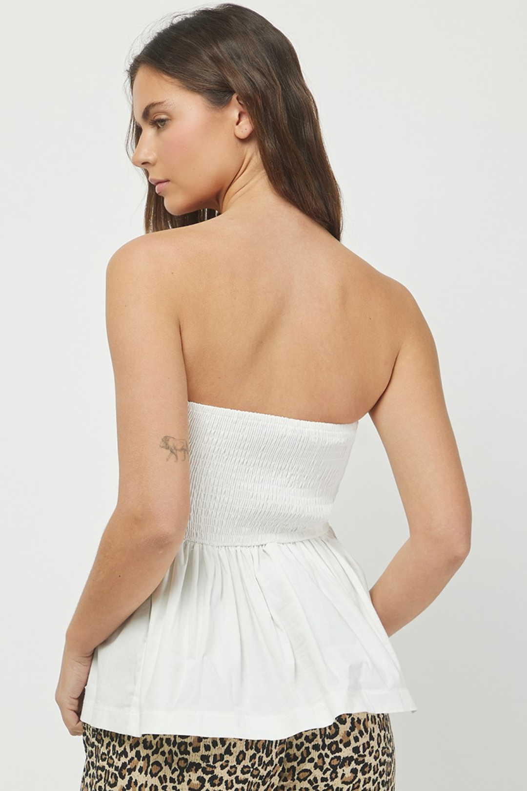 Make Brit Top your newest party go-to! It's a tube top with bubbled peplum, smocking back, and ruffled detail. Ideal for celebrations such as birthdays, bridal parties, vacations, and date nights.