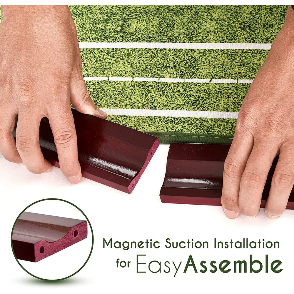 Featuring an auto ball return system and a baffle that helps the ball return to the mat after play, our golf green putting mat is designed with an integrated measuring scale and double sighting lines for you to take accurate shots.