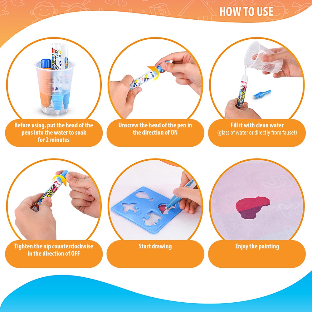 - ENVIRONMENTALLY-FRIENDLY ENTERTAINMENT! – Our water doodle mat can be reused by filling the pen with clean water and simply drawing on the mat. The drawings will magically disappear after a few minutes which means your kids can draw again and again without wasting any paper or making a mess on their clothes or your furniture!