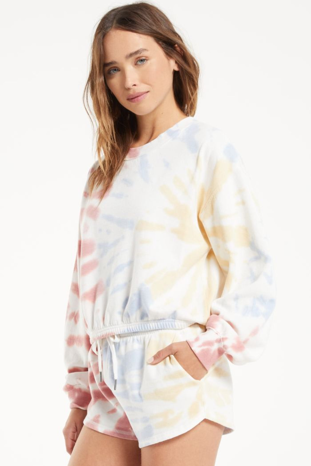 The Britton Tie Dye Pullover has that perfect combination of a pop of color and faded, washed effect. Make the ultimate set by offering it with the matching Malibu Short. This will surely be one of the top selling pieces.