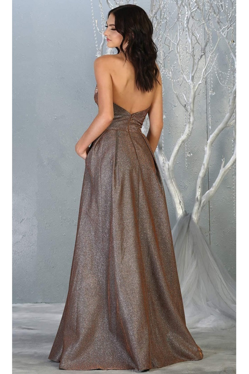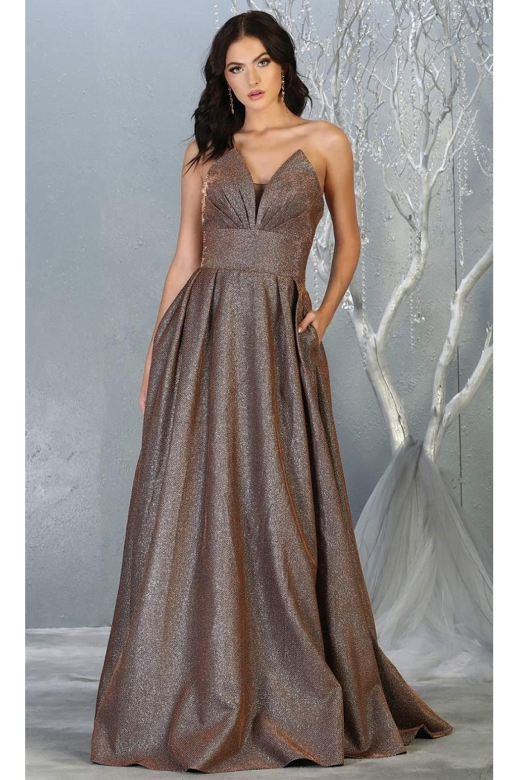 This formal dress features a shining metallic fabric, strapless ruched bodice with pointed v-neckline and mid-open back, and pleated a-line skirt.