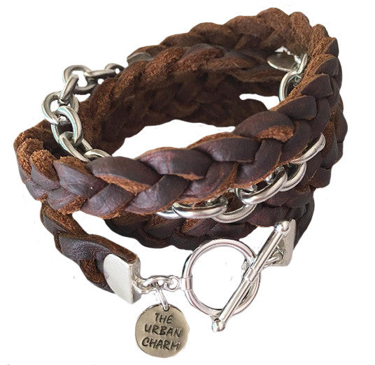 Brown Braided Four Wrap Genuine Leather Bracelet