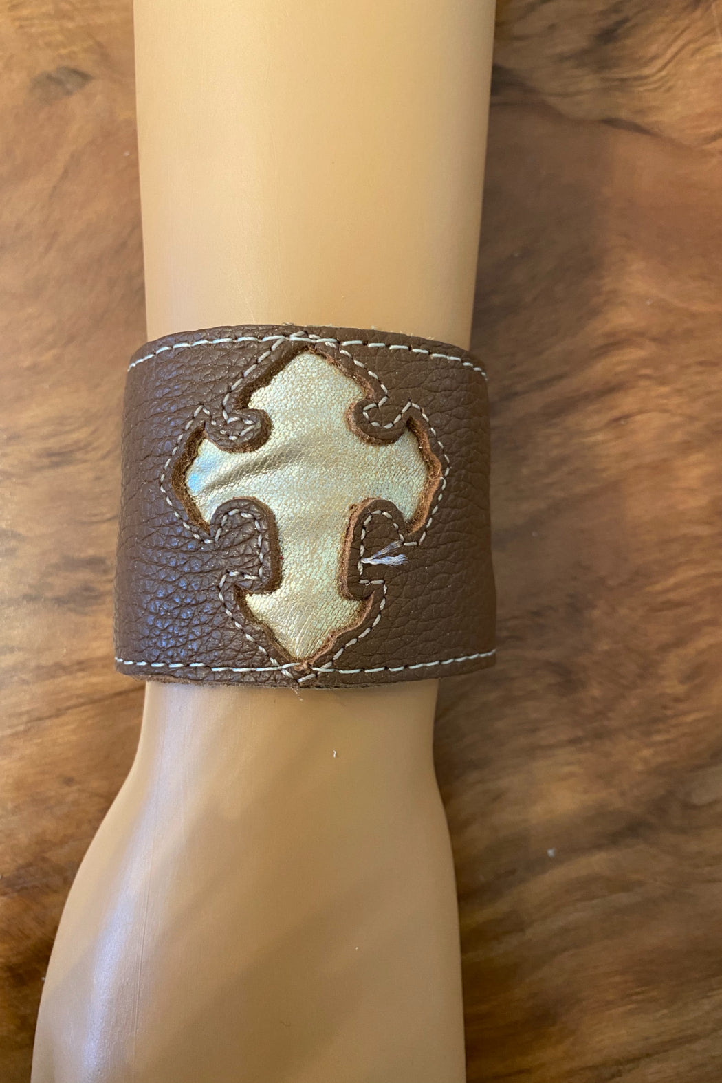Brown handmade leather cross cuff with zipper. Adjustable snap buttons to fit any wrist.