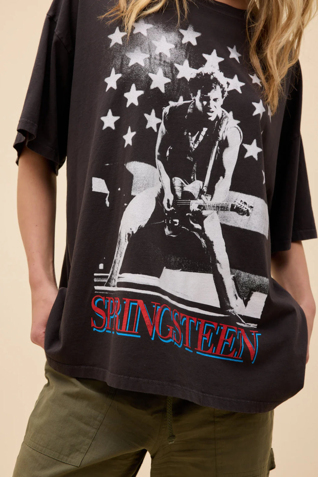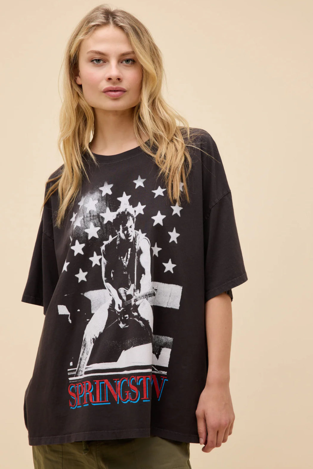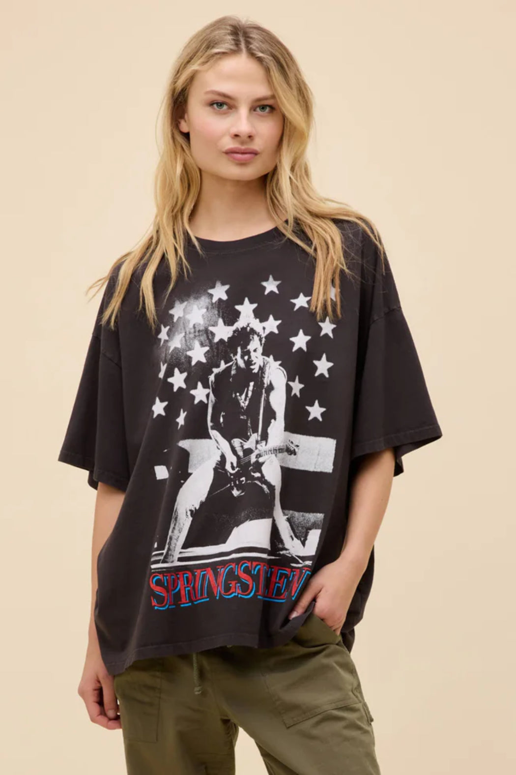Turn up the volume! This Bruce Springsteen Photo Oversized Tee channels pure rock legend energy. With its lived-in, reactive black wash and iconic stage photo print, it's the kind of piece that looks like you thrifted it from a '70s concert tour trunk. Perfect for weekend hangs, vintage record store strolls, or layering under a leather jacket for that off-duty rockstar vibe.