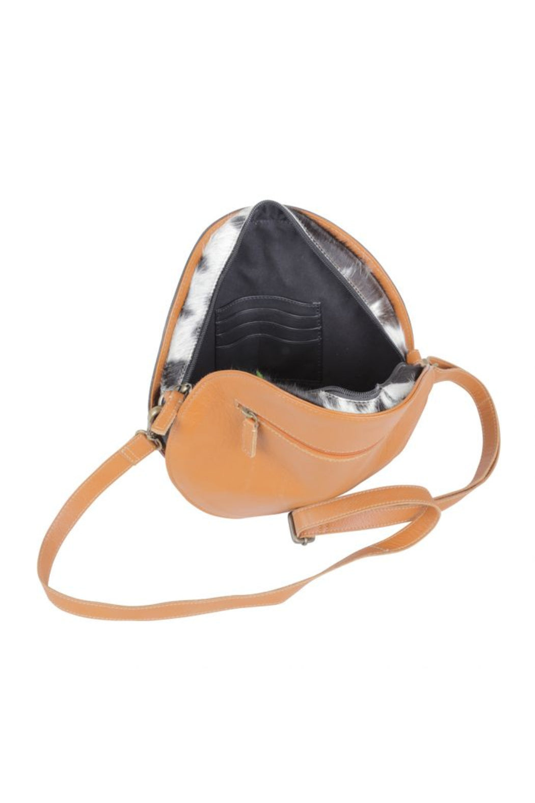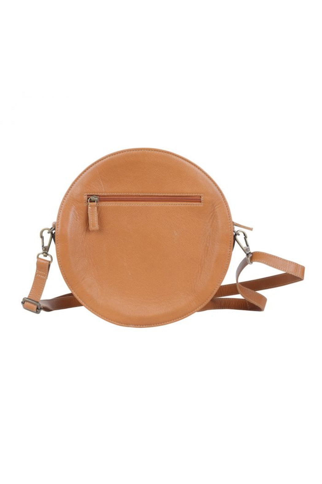 Dare to dazzle with our round sling bag. A popular product with leather and hide construction, adjustable strap and delicate hand tool work.