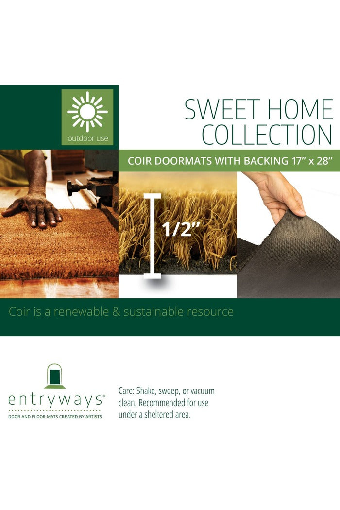 100% coir with backing and constructed to the highest industry standards Coconut fiber (coir) is natural, biodegradable, and an excellent dirt-trapper known for its scraping abilities Hand-stenciled with eco-friendly dyes Measures 17" by 28" and is 1/2" thick Care: Shake, sweep, or vacuum clean Use under a sheltered area out of the elements