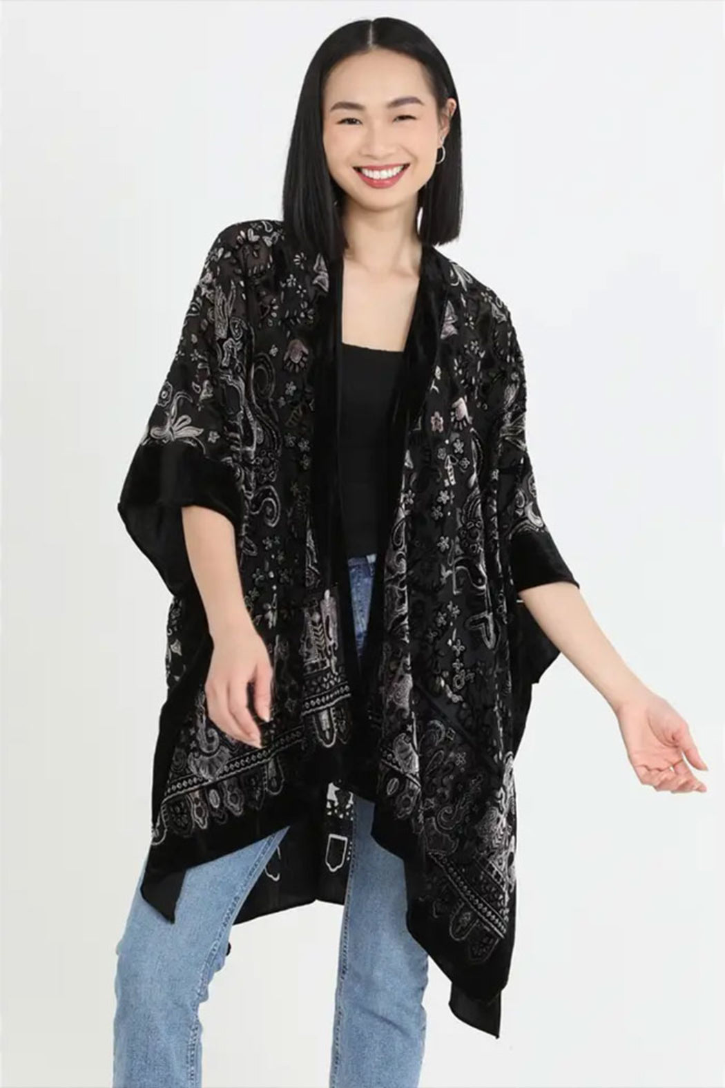 Burnout Velvet Kimono. A brand deeply rooted in bohemian and vintage influences. This black kimono, designed with an abstract & geometric pattern, exudes a well-traveled, romantic spirit. It's bold, yet instantly wearable, making it a versatile addition to your wardrobe. Perfect for formal and everyday occasions, it's a junior fit with short sleeves. Angie is truly the every girl brand. Made in India.