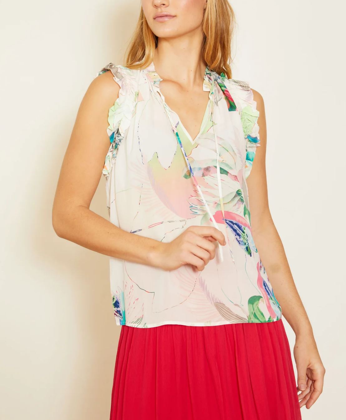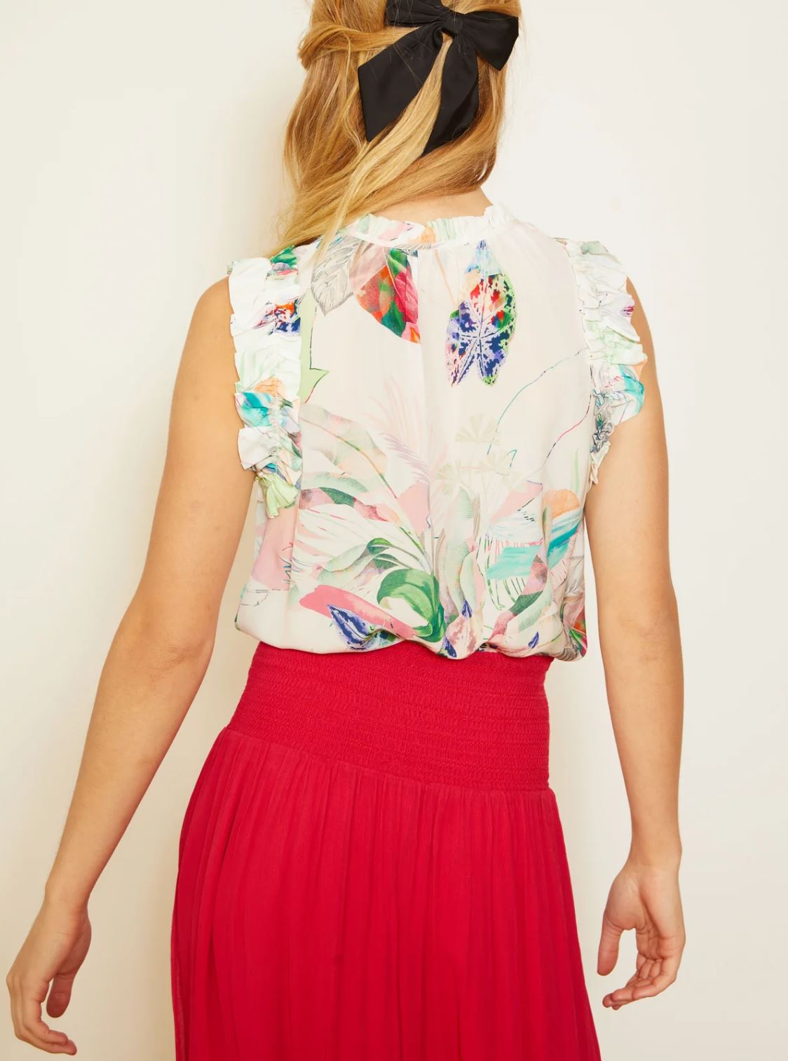 Alani is one of our most popular short sleeve tank tops, showcases standing ruffles at the neckline and arms for added femininity, featuring a fresh contrast print with belle palm fabric, adorned with intricate motifs and flowers. Crafted from 100% Viscose, it's perfect tucked into your favorite skirt or jeans, skimming the hips in the most flattering spot, blending style and comfort seamlessly. Belle Palm Print is a french Riviera inspired floral cream ground with light colors green, peach and pink.