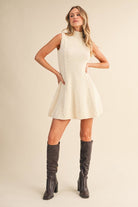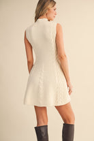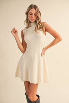 Cable knit sleeveless flare mini dress. Model is wearing a size Small