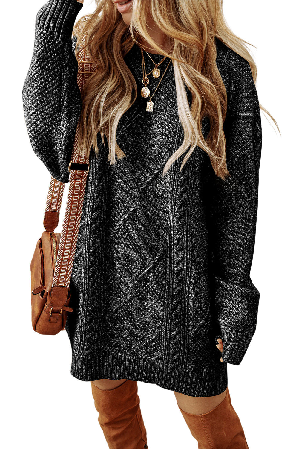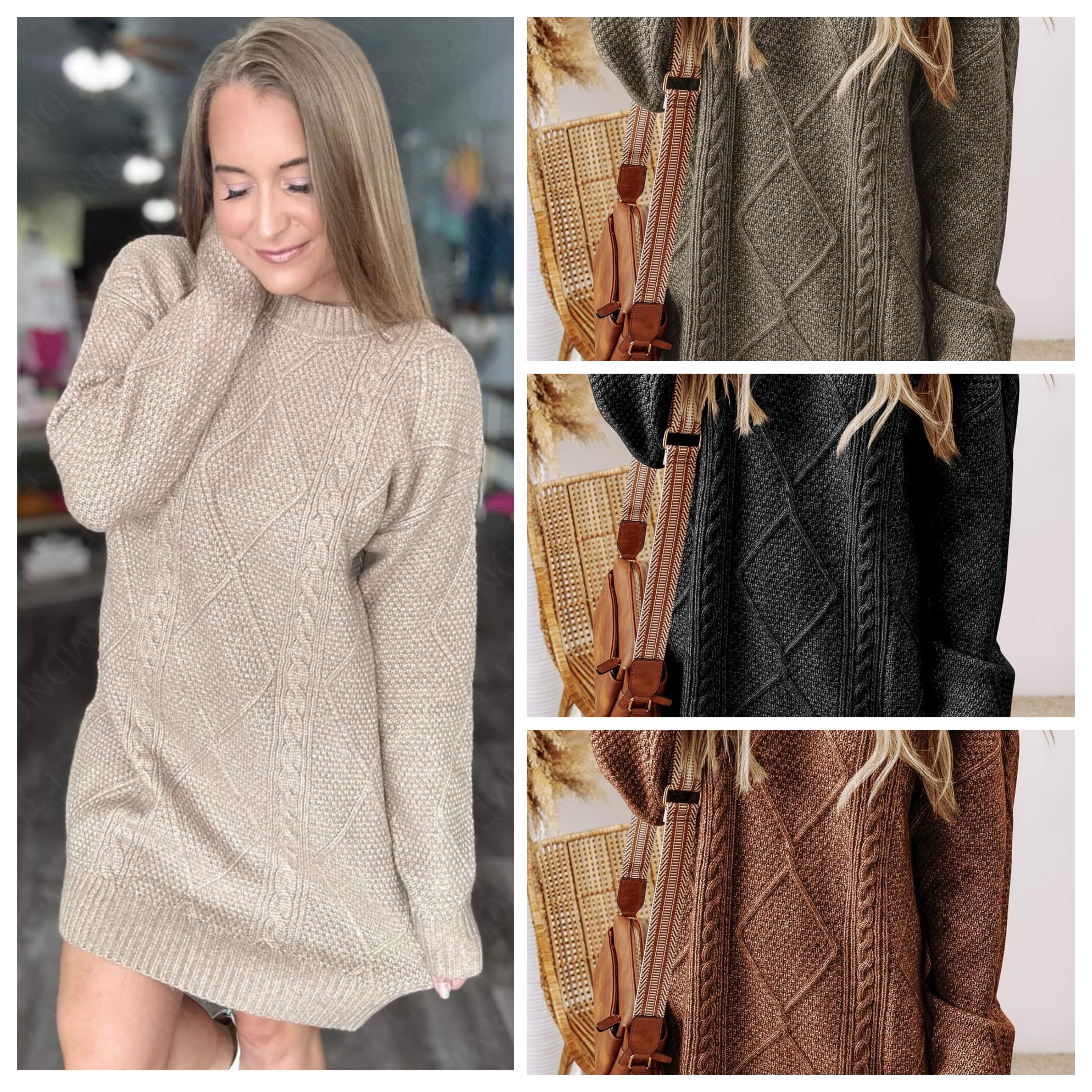Indulge in the warmth and comfort of our Cable Knit Sweater Dress. The chic twist cable knit design adds a stylish touch, while the drop shoulder silhouette and loose fit offer modernity and versatility. Crafted with high-quality materials and a rib-knit texture, this dress is perfect for casual outings or relaxing at home. The neutral color allows for endless styling options and is the perfect addition to your cold-weather wardrobe.