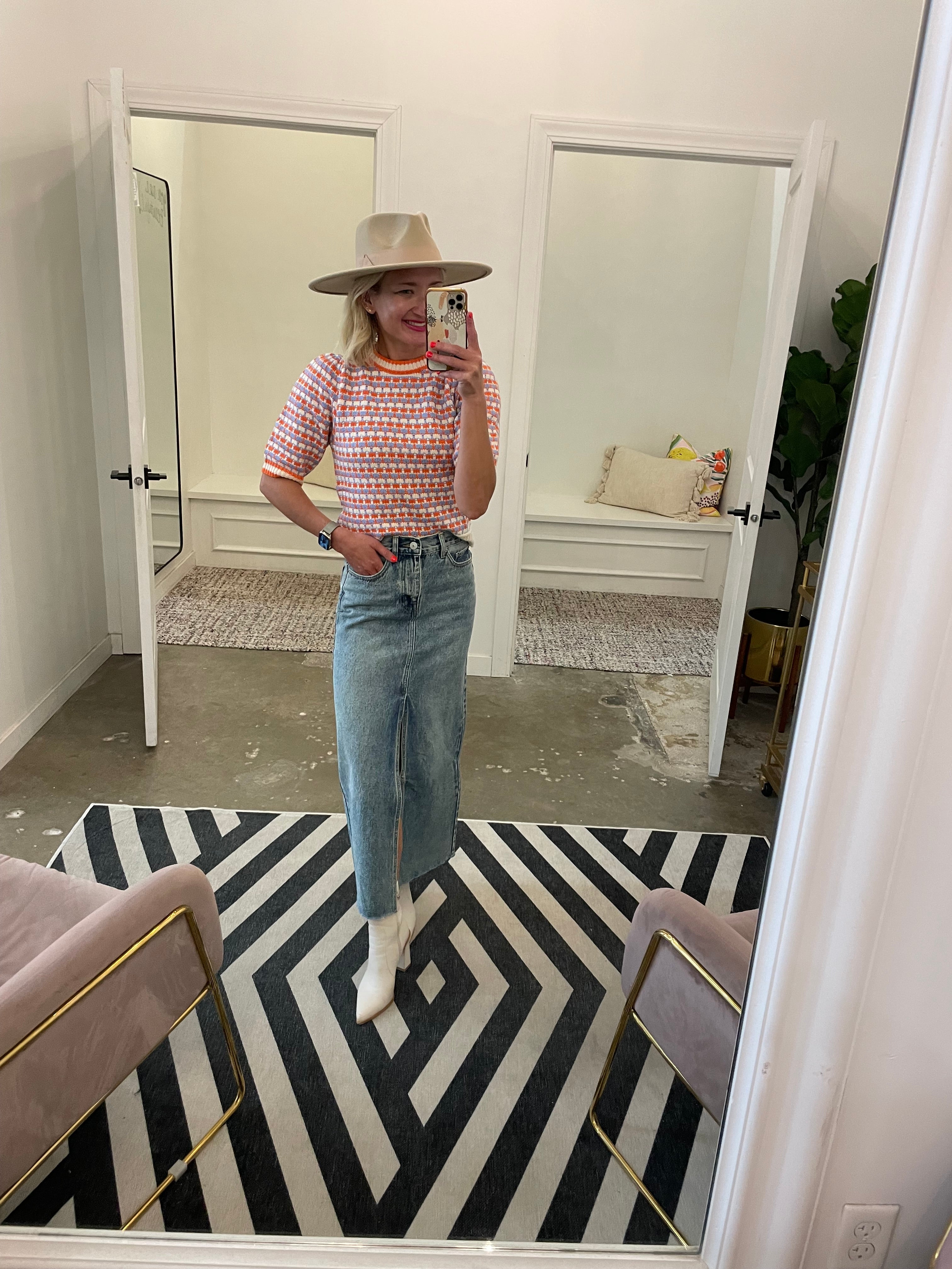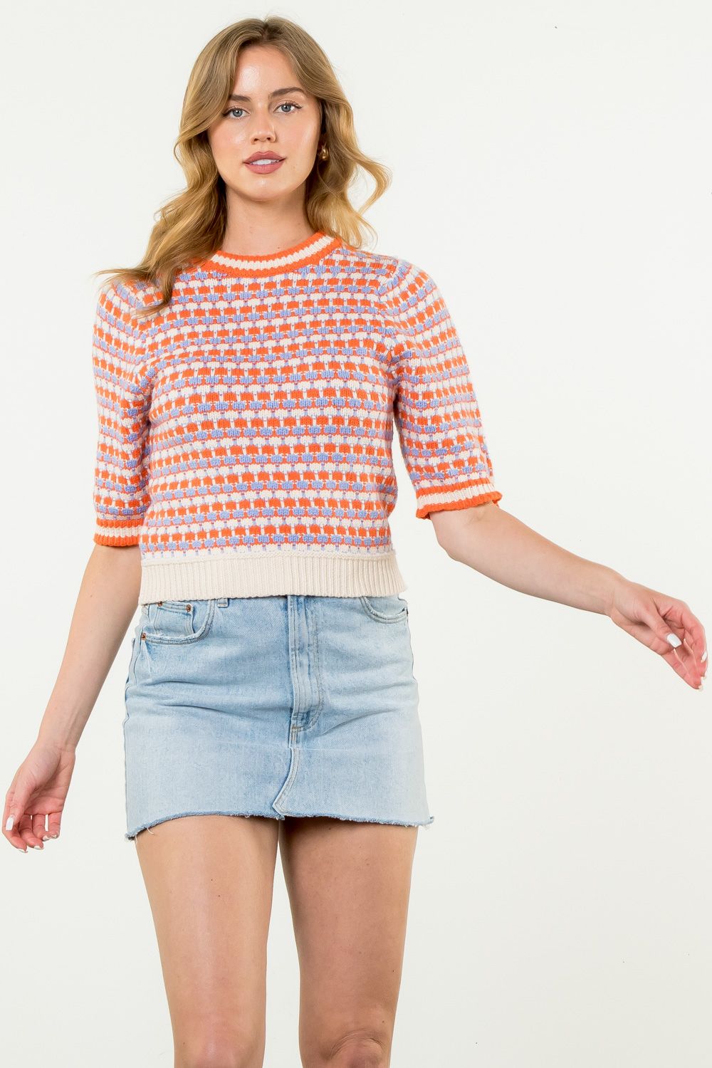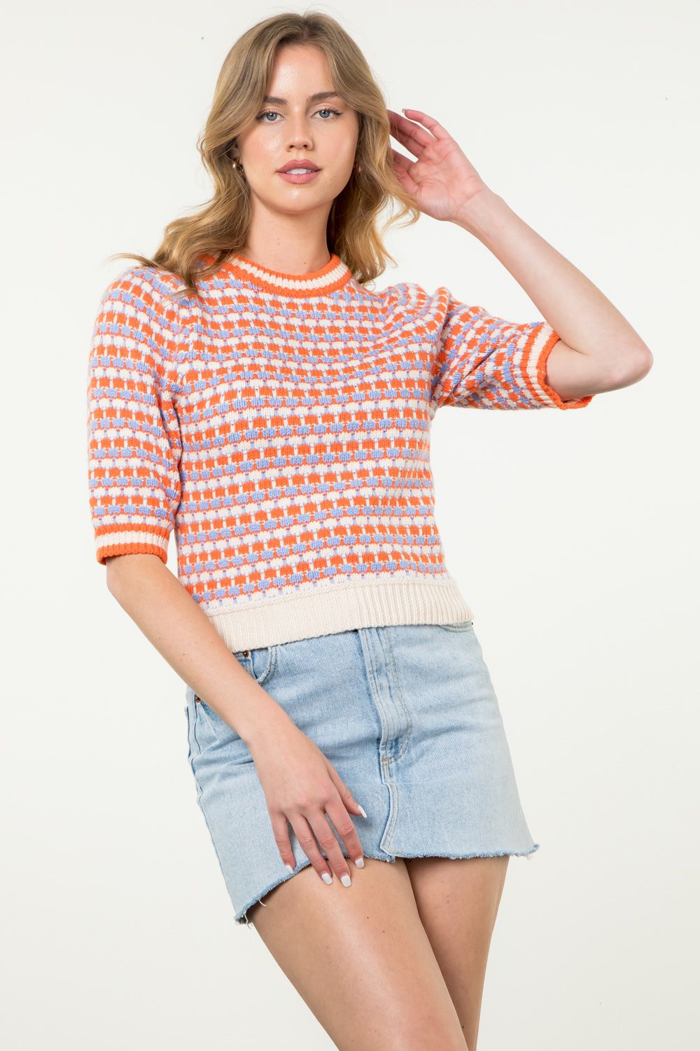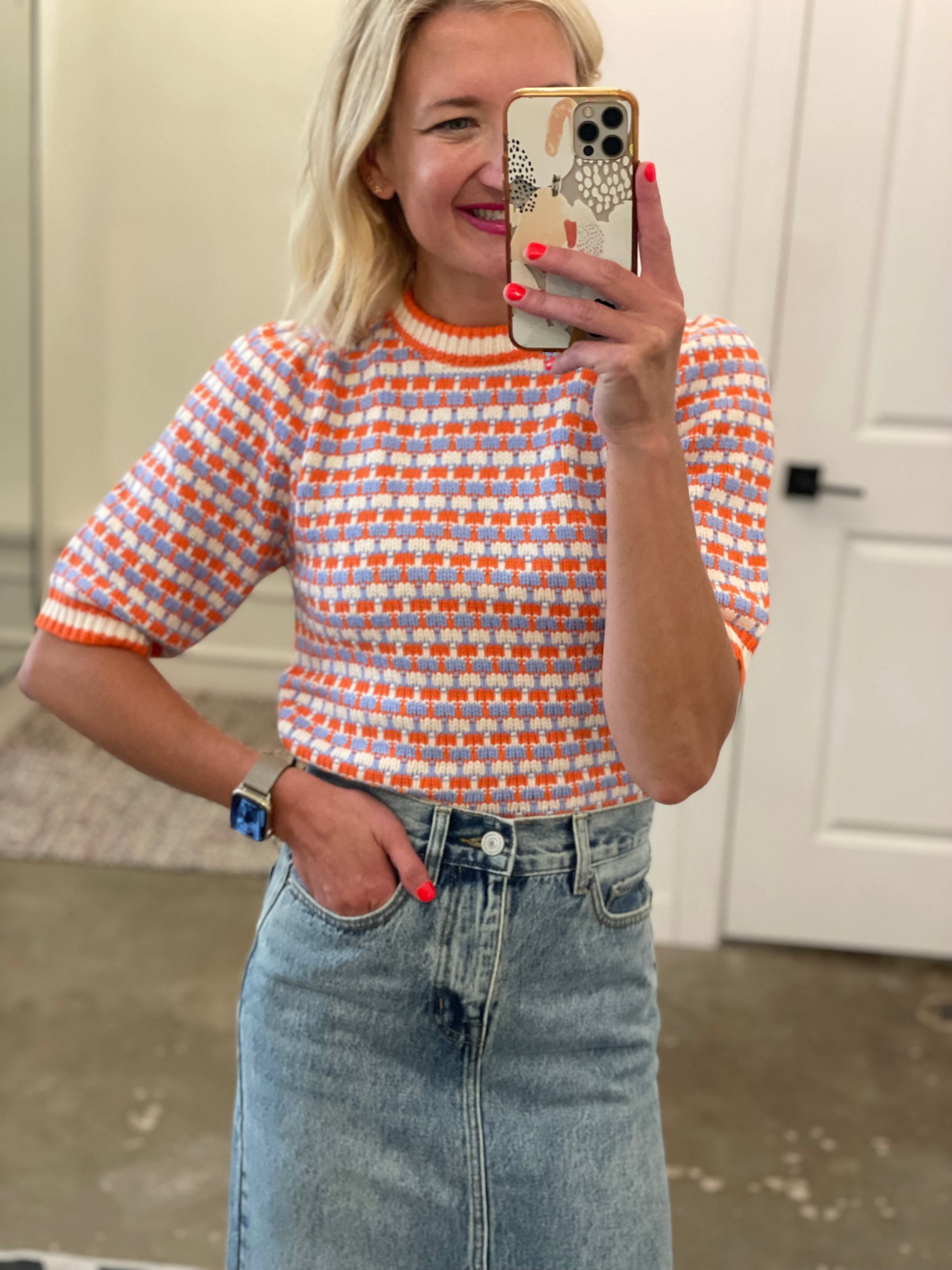 The Cameron is a cute patterned knit with a slight puff sleeve. The color combination works well together! Pair with faux leather shorts or denim. Fits TTS