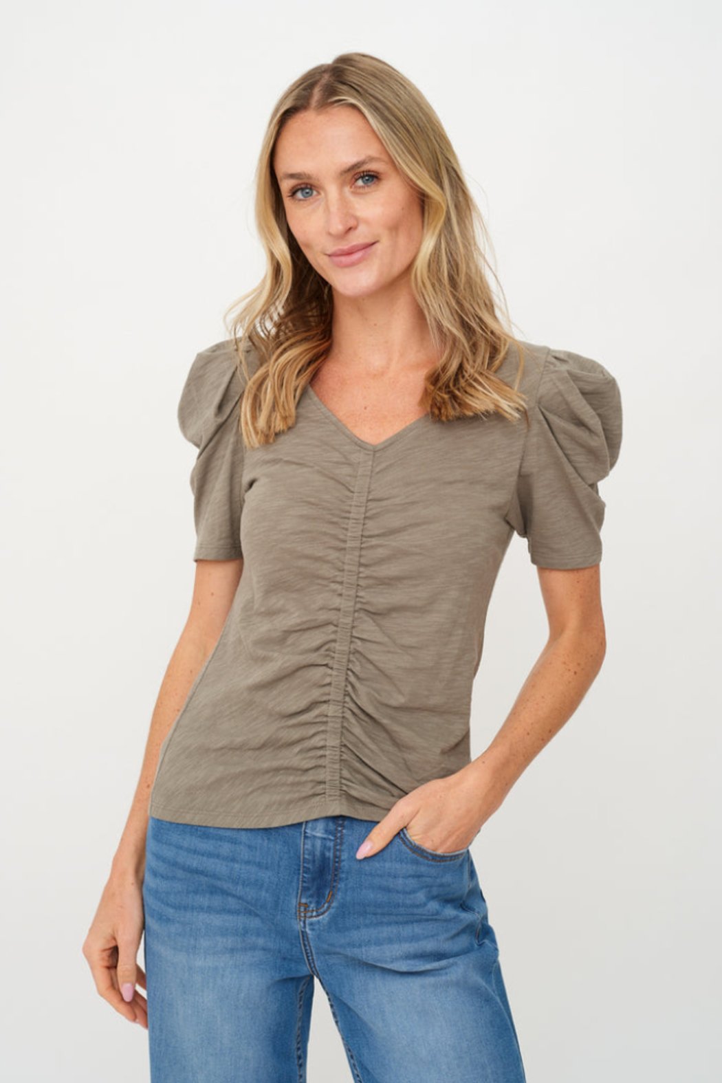 Introducing the Camilla Tee! Featuring charming puffed sleeves and ruching down the center, this lightweight v neck tee is perfect for everyday wear. Stay cool and stylish with its short sleeves. Who says basics have to be boring? Not us!