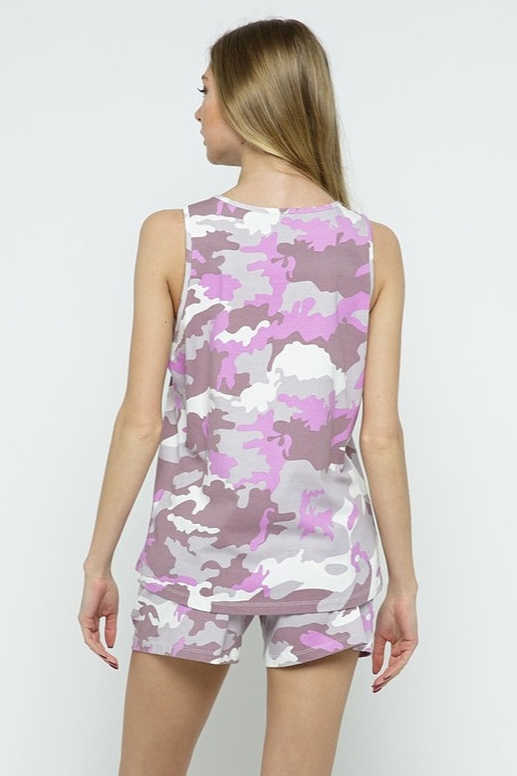 This camo printed lounge set features a sleeveless tank top with a U neck line and lounge shorts with an elastic waist band, a drawstring and side pockets. We love these pieces for lounging around your house or for a casual day out at the beach.