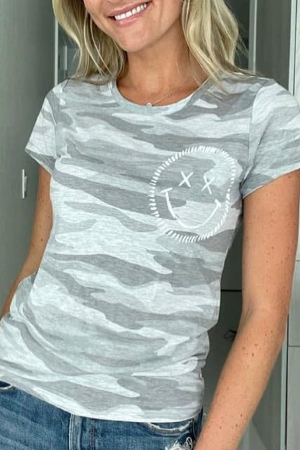 This casual t shirt features a short sleeve, a camo print, a crew neck line and a smiley face detail on the front. This is a great top to pair with jeans or you favorite joggers for a casual and fun look.
