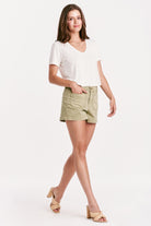 High rise shorts with standard hem. It's the classic fit that sits at natural waist and fitting comfortably in the hip and thigh. Shorts inseam on stretch woven with front patch pocket for the chic look.
