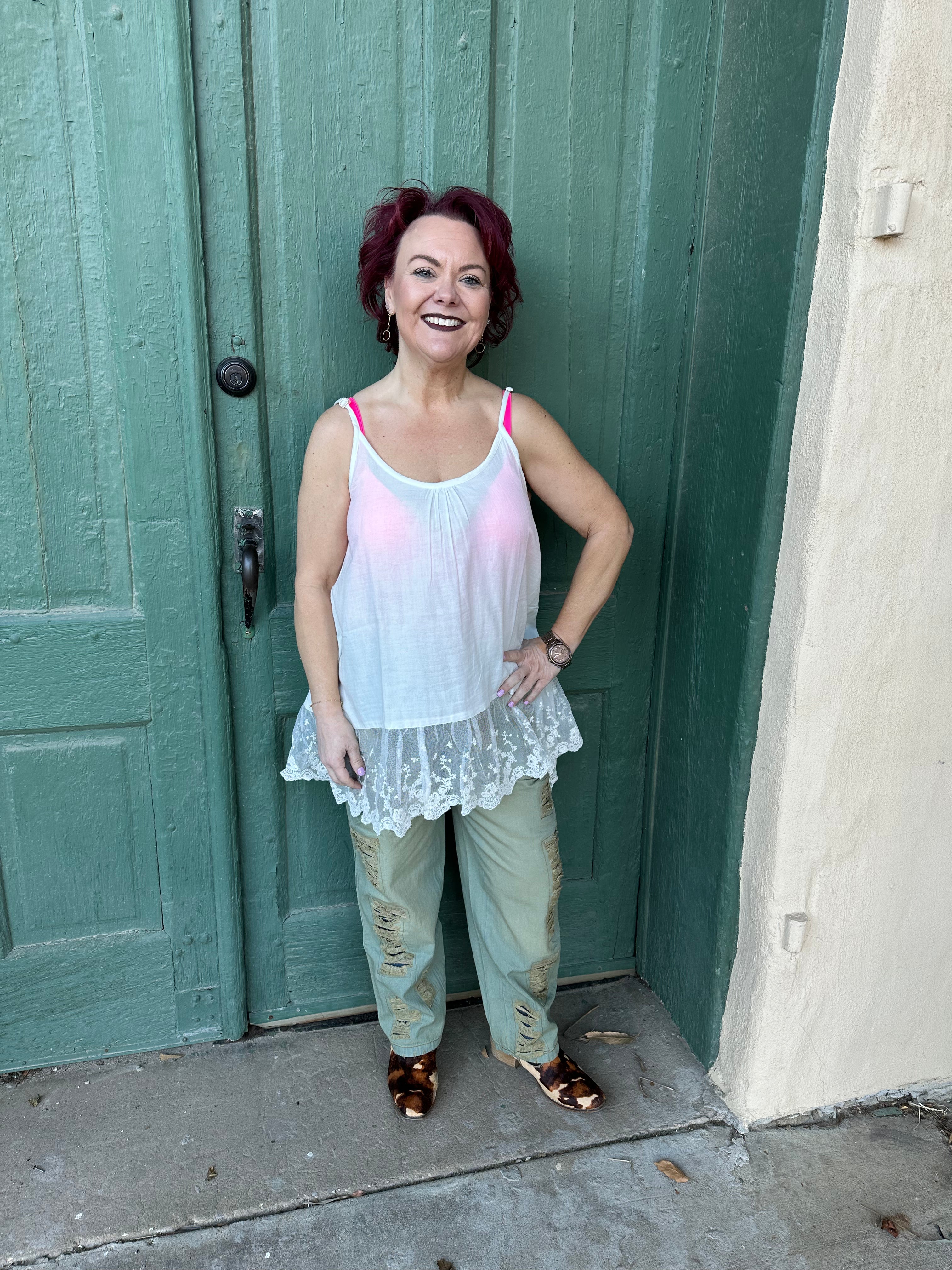 You'll love this beautiful cami shell in a creamy, off-white color! From the premium egyptian cotton, to the delicate lace hem detail, you'll love layering this piece or wearing it all by itself!