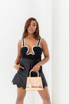 Introducing the Carlita Top, a luxurious black top with white stripe detailing that exudes sophistication and exclusivity. The clever cutout and adjustable straps add a touch of artful elegance, while the thong bodysuit style offers a sleek and flattering fit. Elevate your wardrobe with this tasteful and versatile piece.