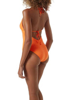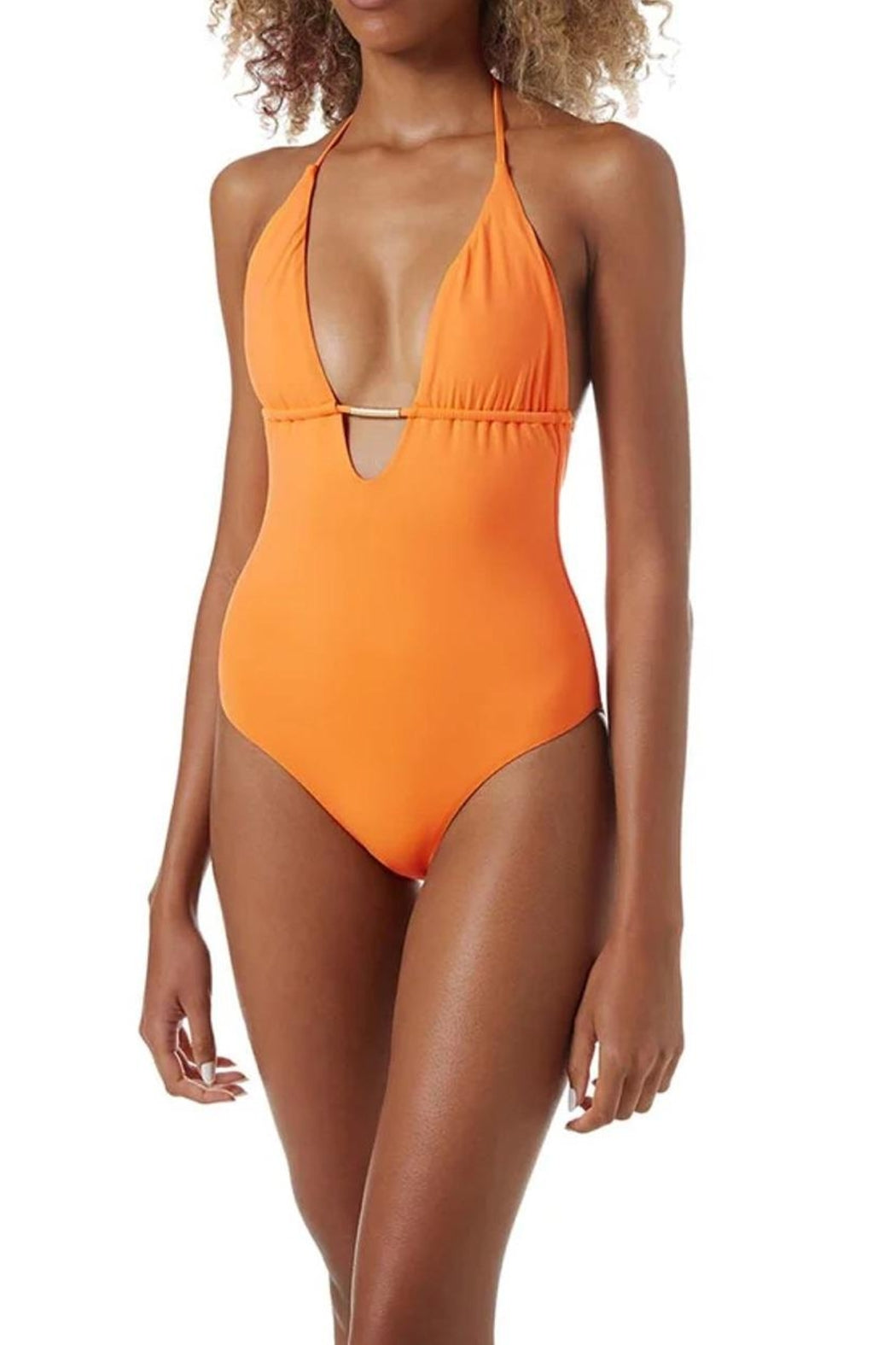 Melissa Odabash "Casablanca" one-piece swimsuit features a keyhole cutout and tubular hardware Halter neckline; soft ties behind neck Removable soft cups Self-ties at mid-back Moderate seat coverage Polyamide/elastane..