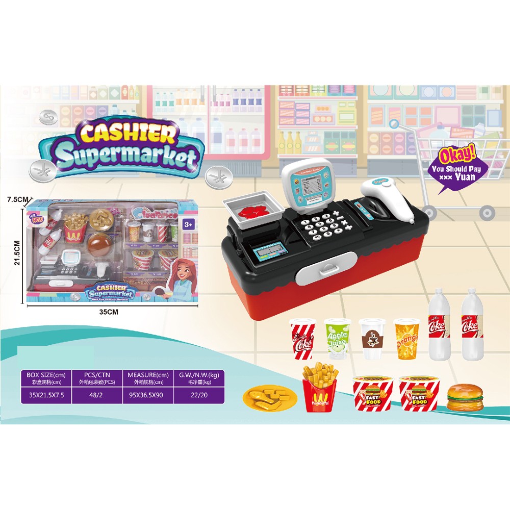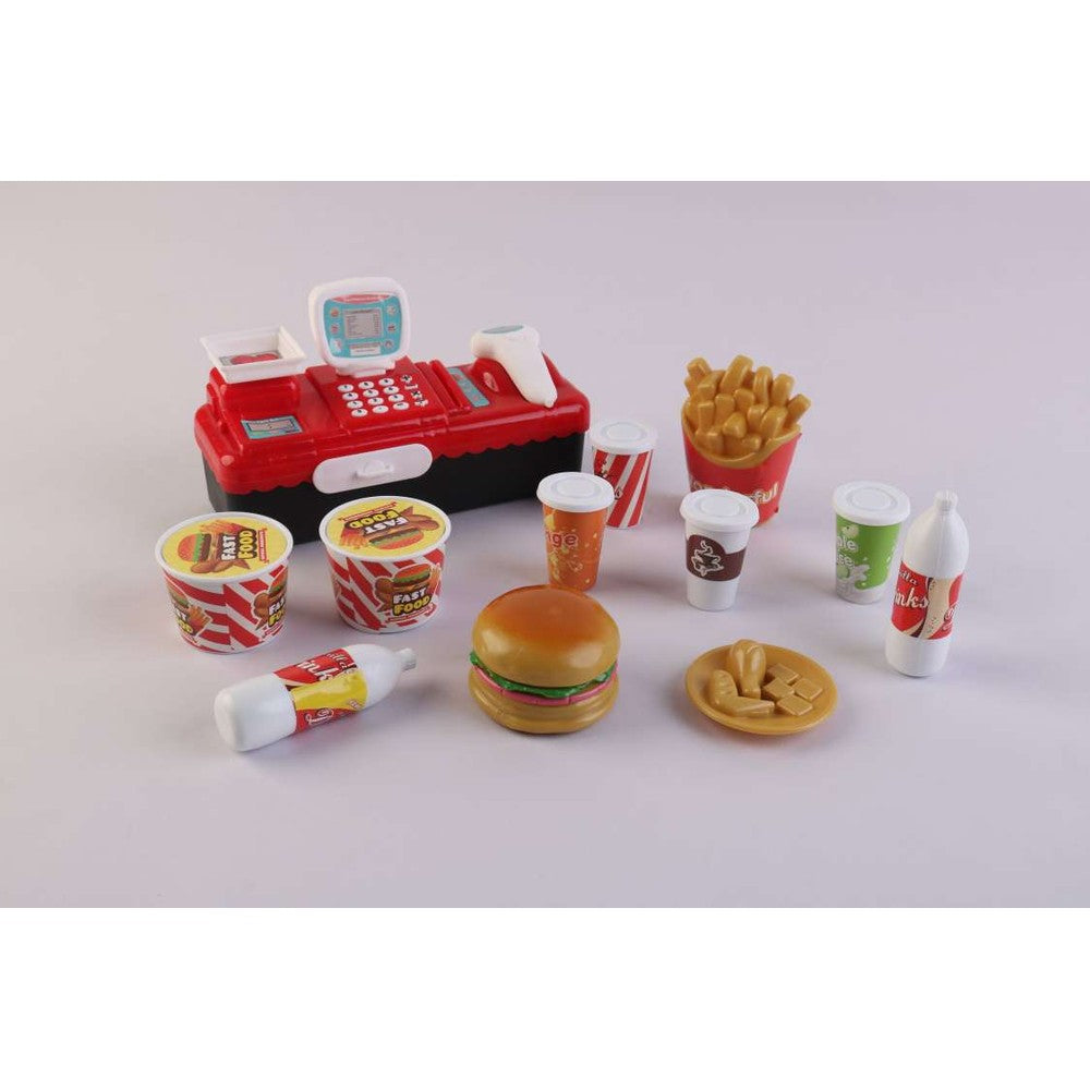 - A COMPLETE ROLE PLAY SET – It includes a cash register, Fast food play set, hamburger, 2 drink bottles, Coffee cup, French fries, all for the satisfaction and enjoyment of the kids.
