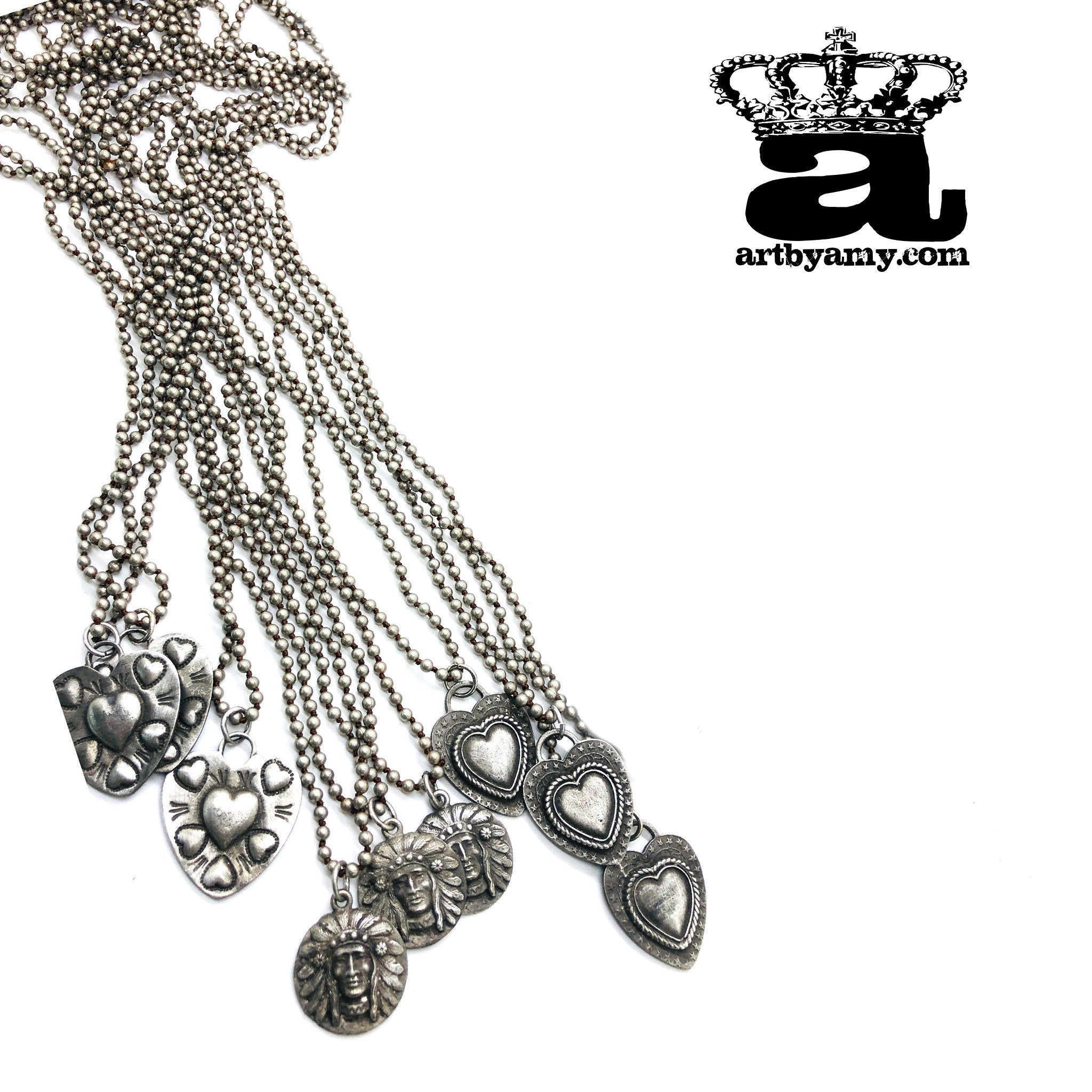 The Cast Away Love necklace is a fun simple every day necklace that can be looped and scarfed, doubled, knotted, or worn long. The cast charm is approx 1.25 -1.5 inches. Choose your heart (6 heart or single), or Indian head. Each are on a knotted small faux navajo metal bead necklace.