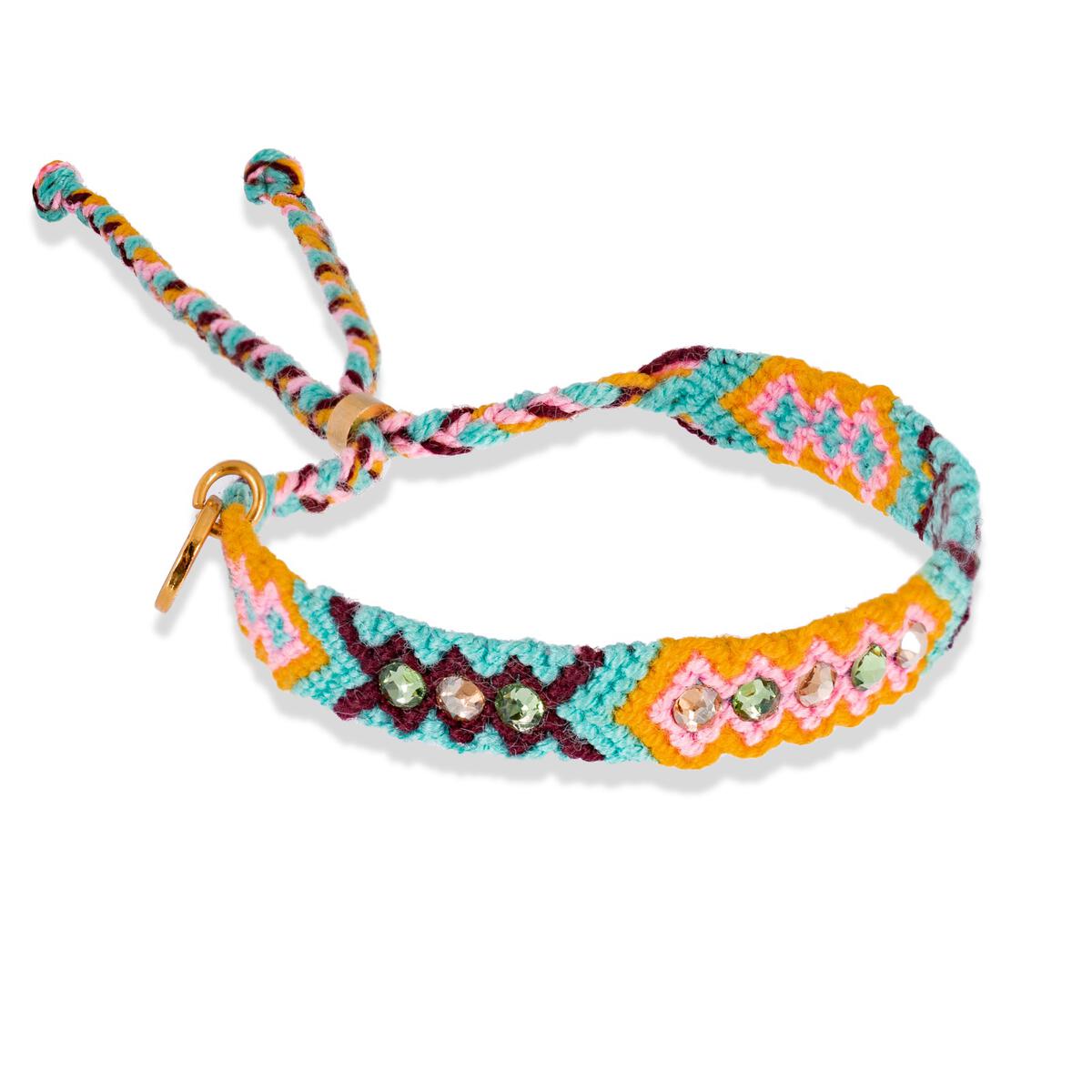 Wayuu bracelet with Swarovski crystals and adjustable gold-colored clasp.