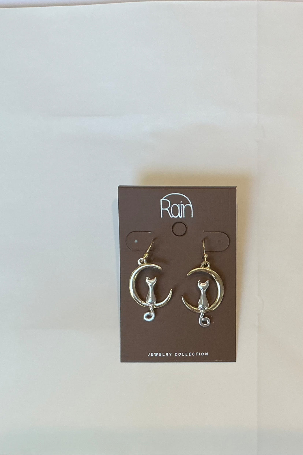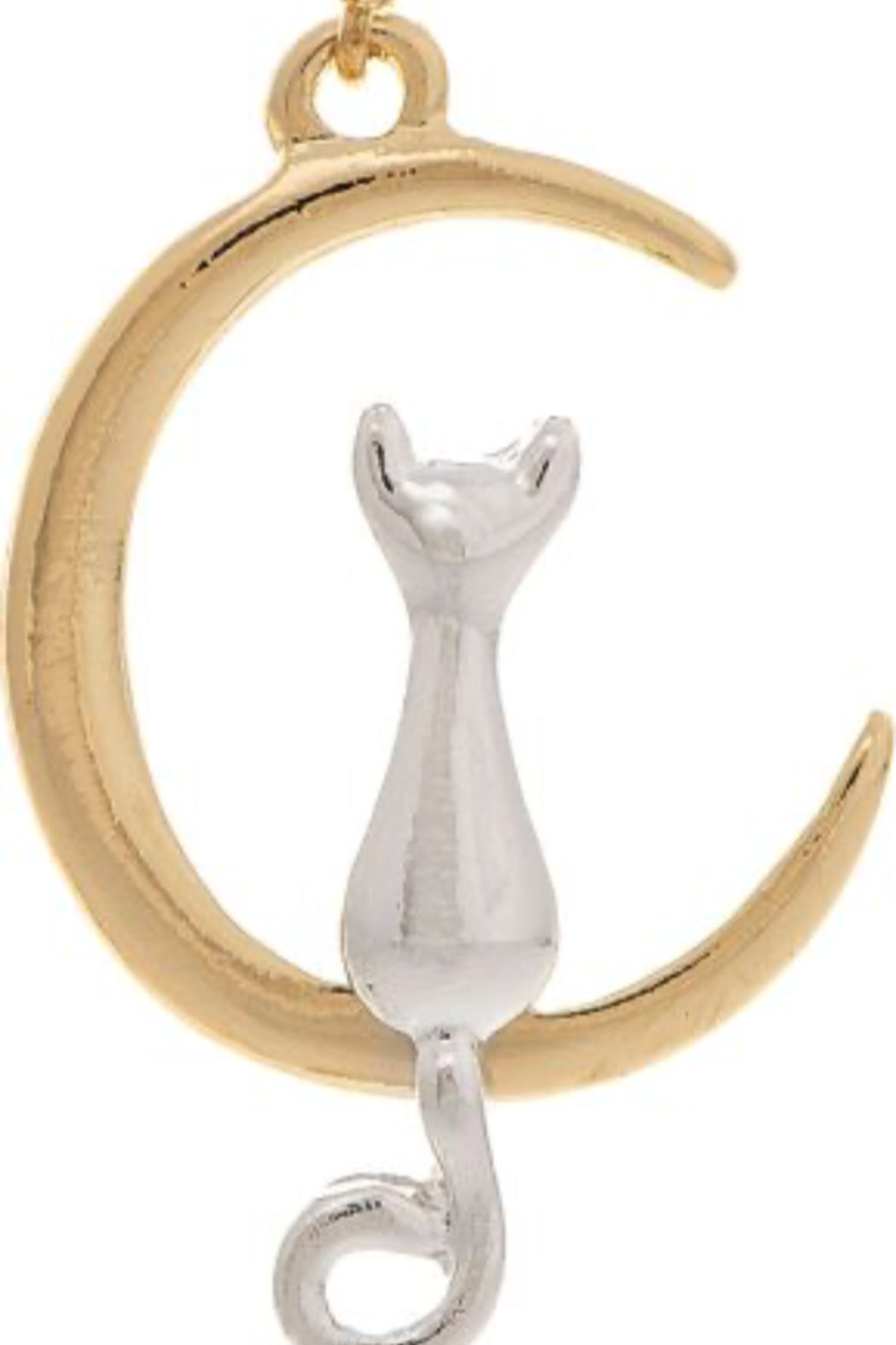Shiny Gold Tone Moon Dangle Earrings with Shiny Silver Cat. Pierced Fish Hook wire backs