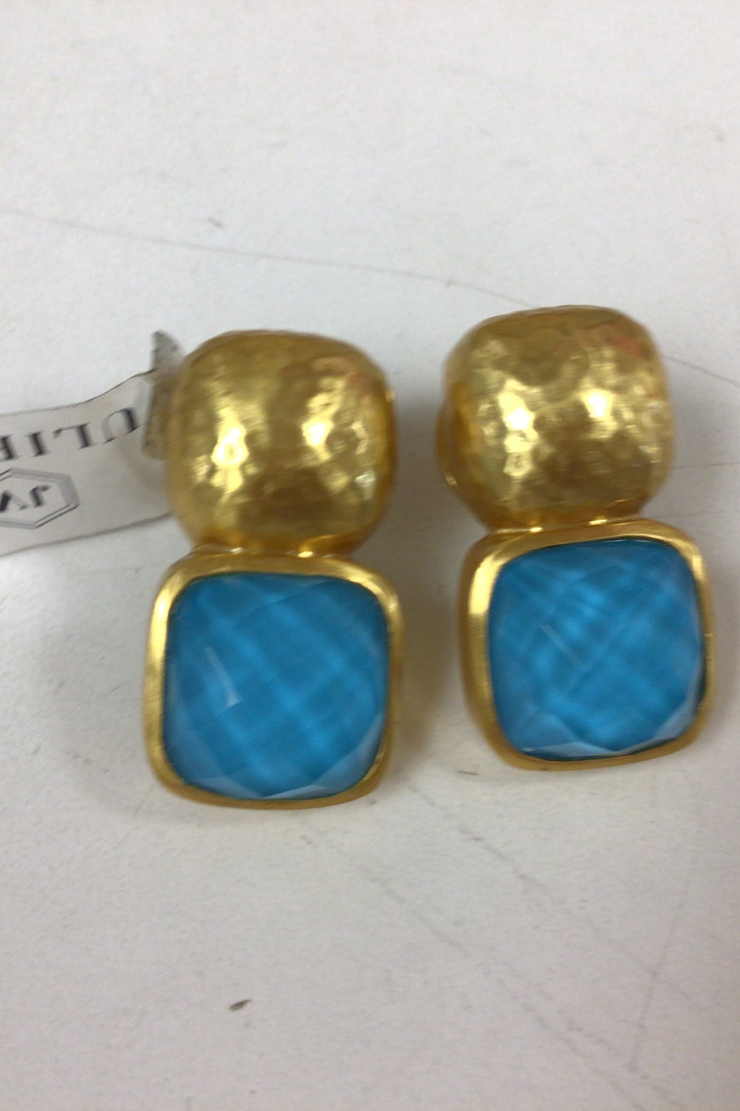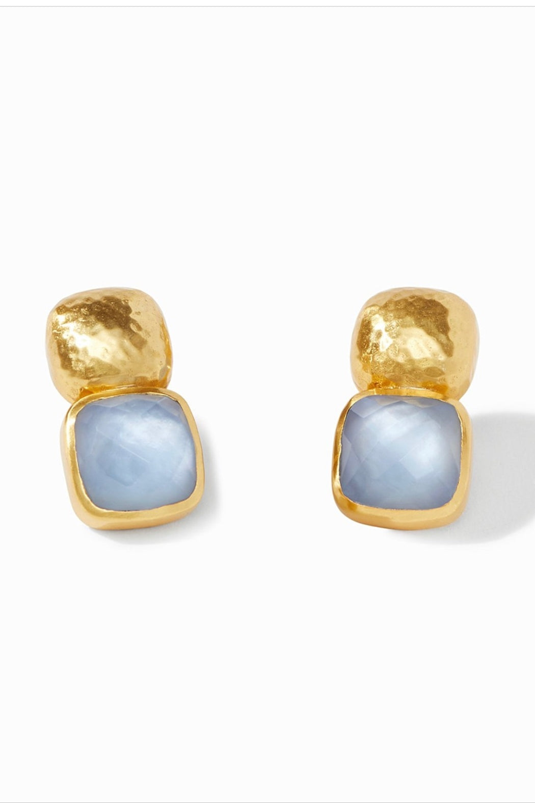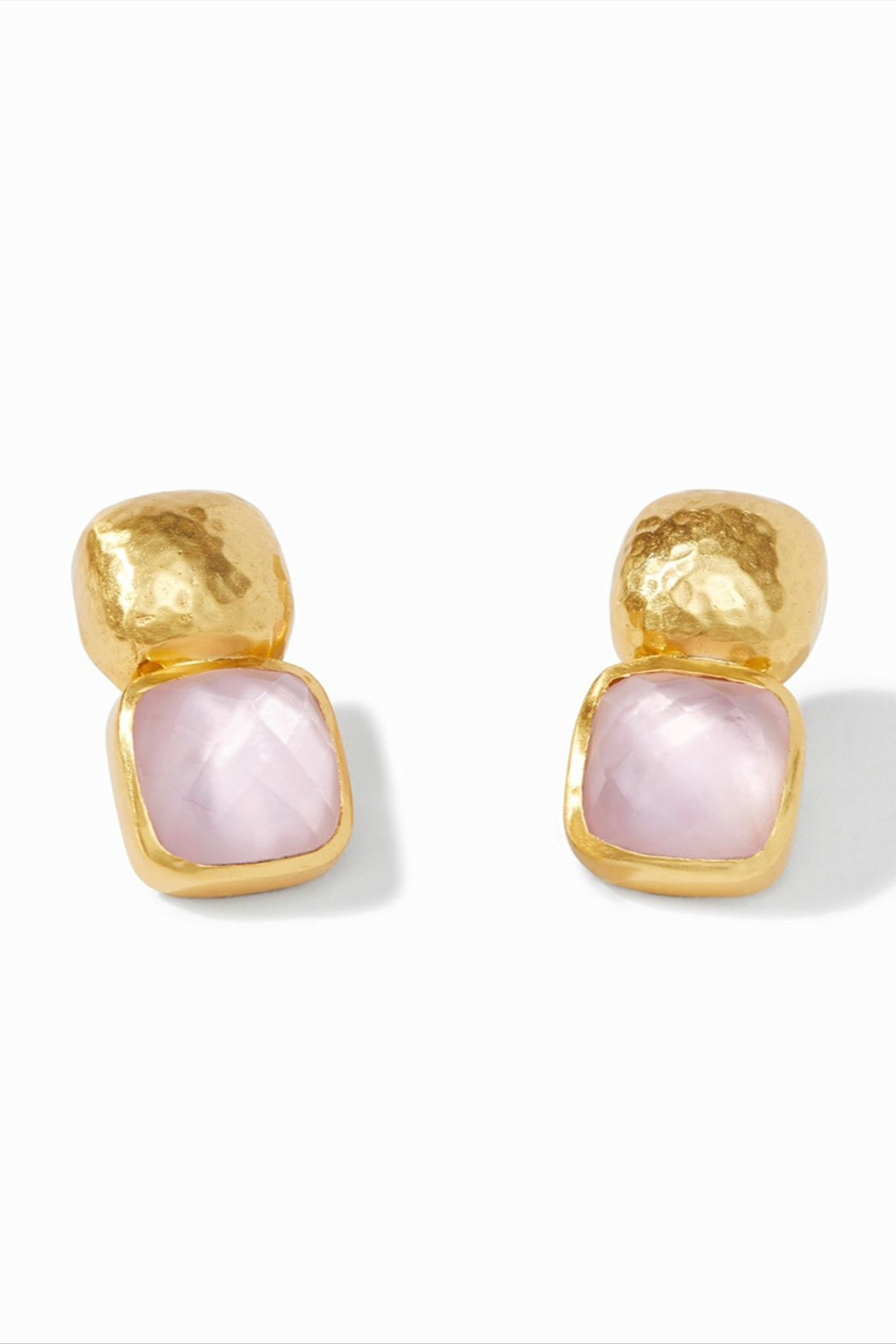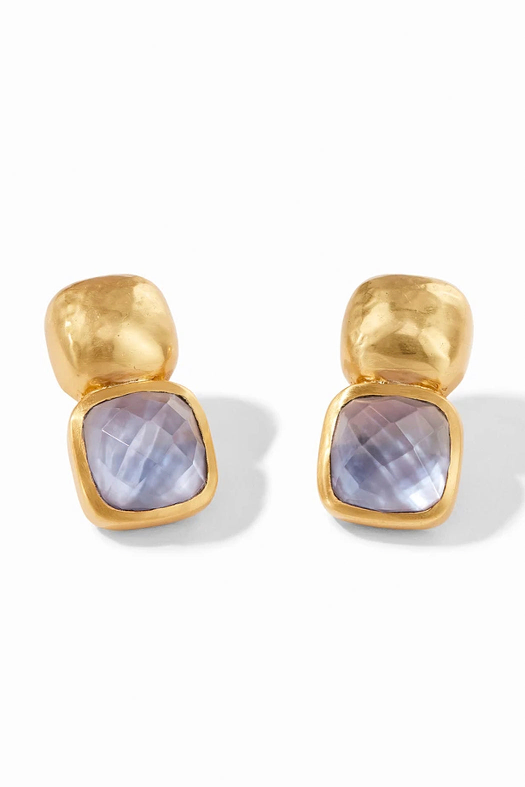 Faceted cushion shape gemstone of rose cut glass topped with a hammered soft square. For pierced ears.