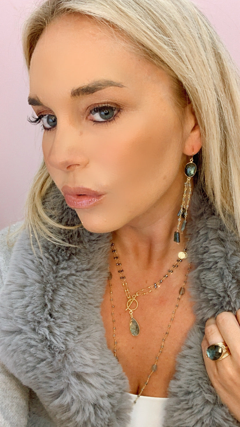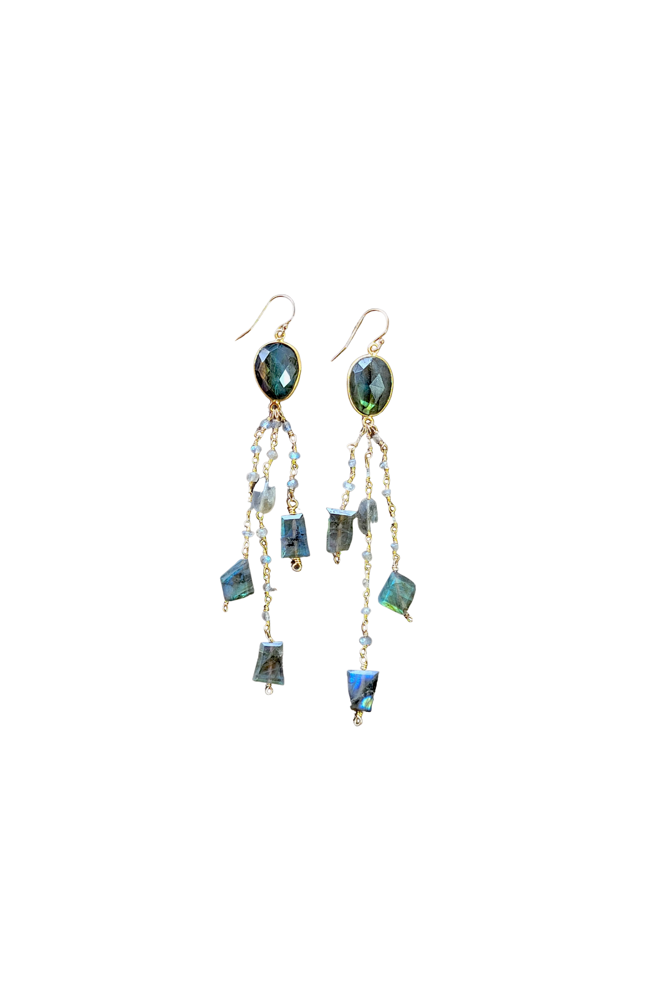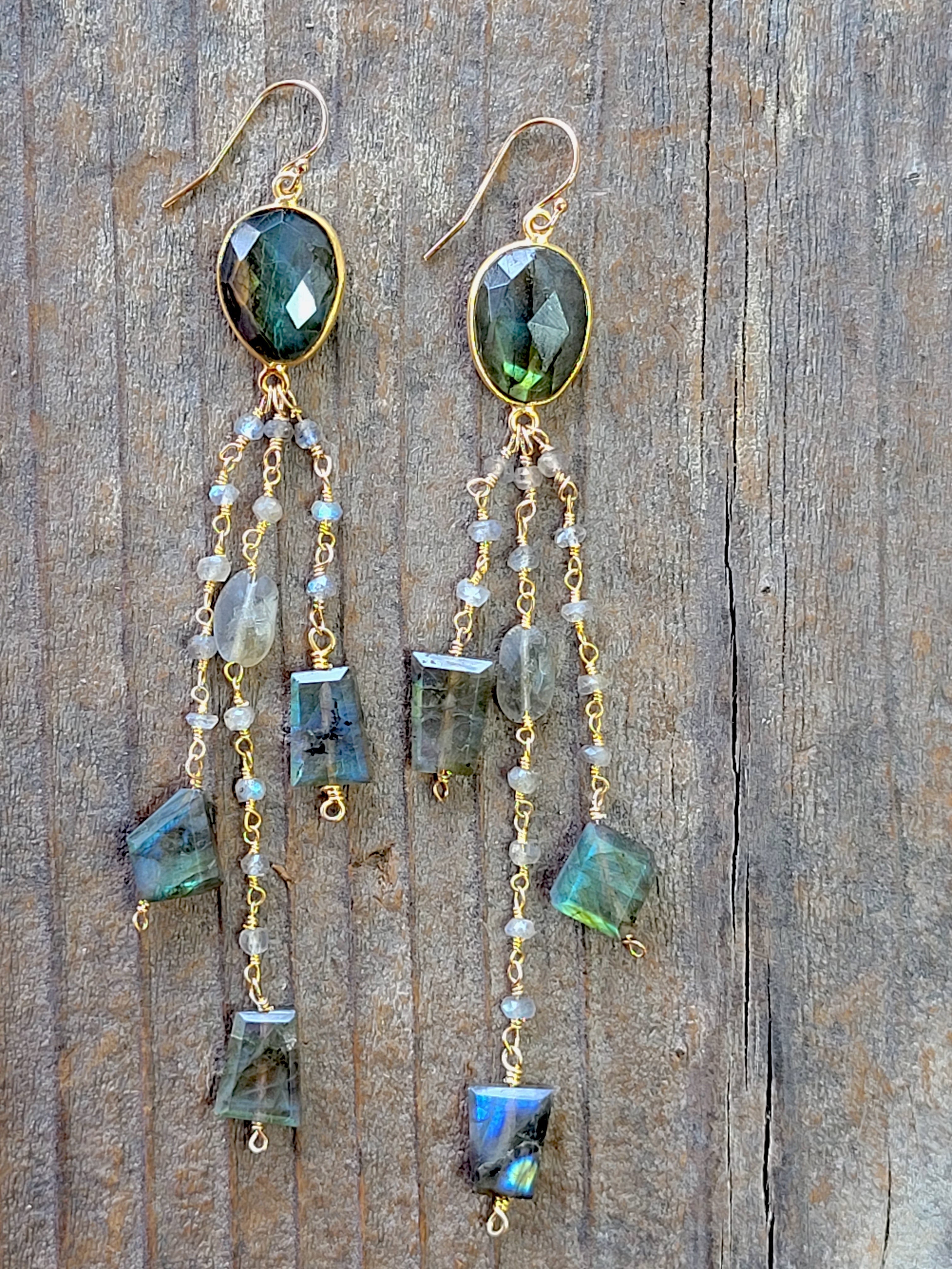 Gold dangle earrings with one labradorite drop leading into 3 staggered labradorite beaded chain drops.