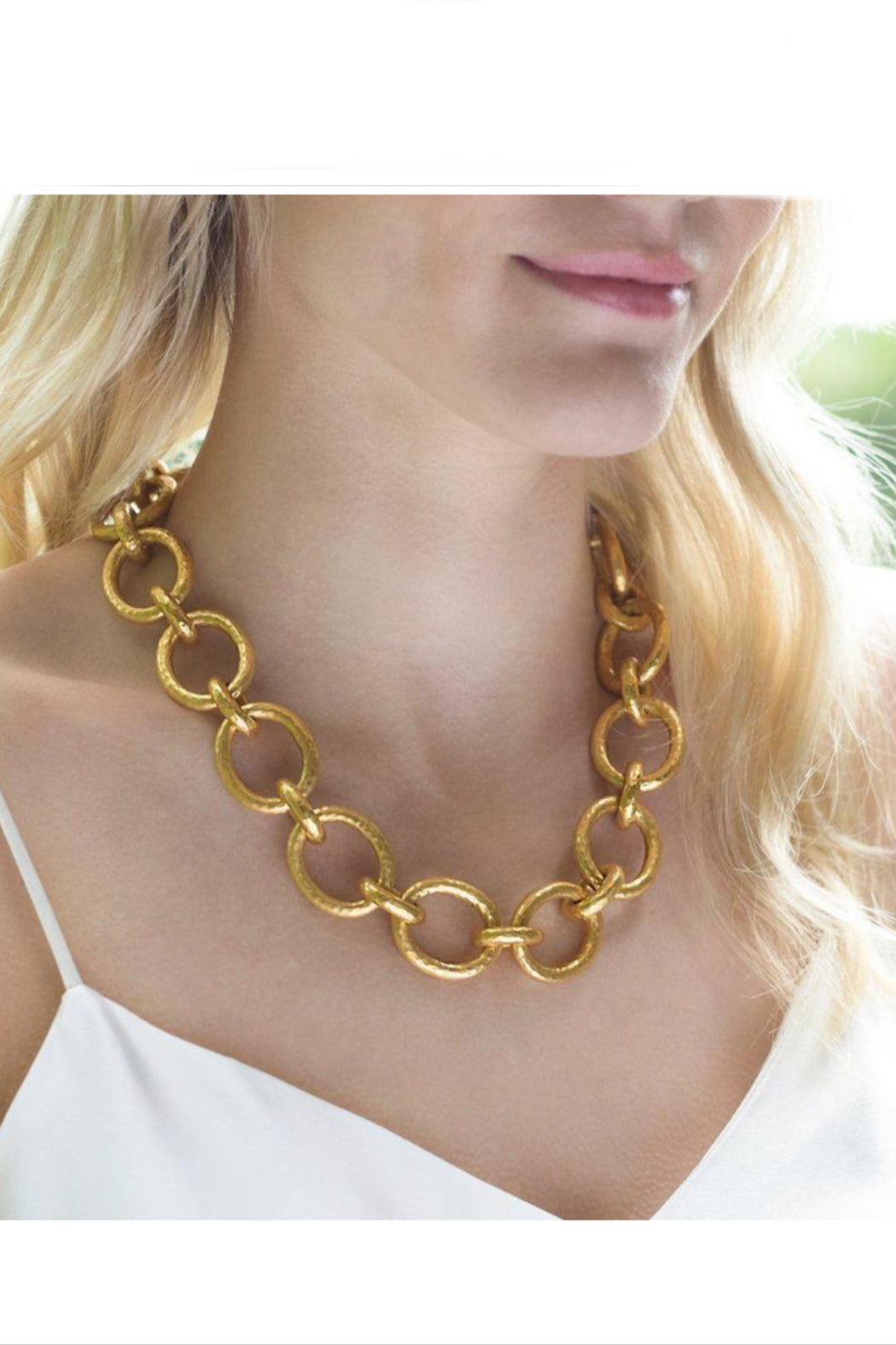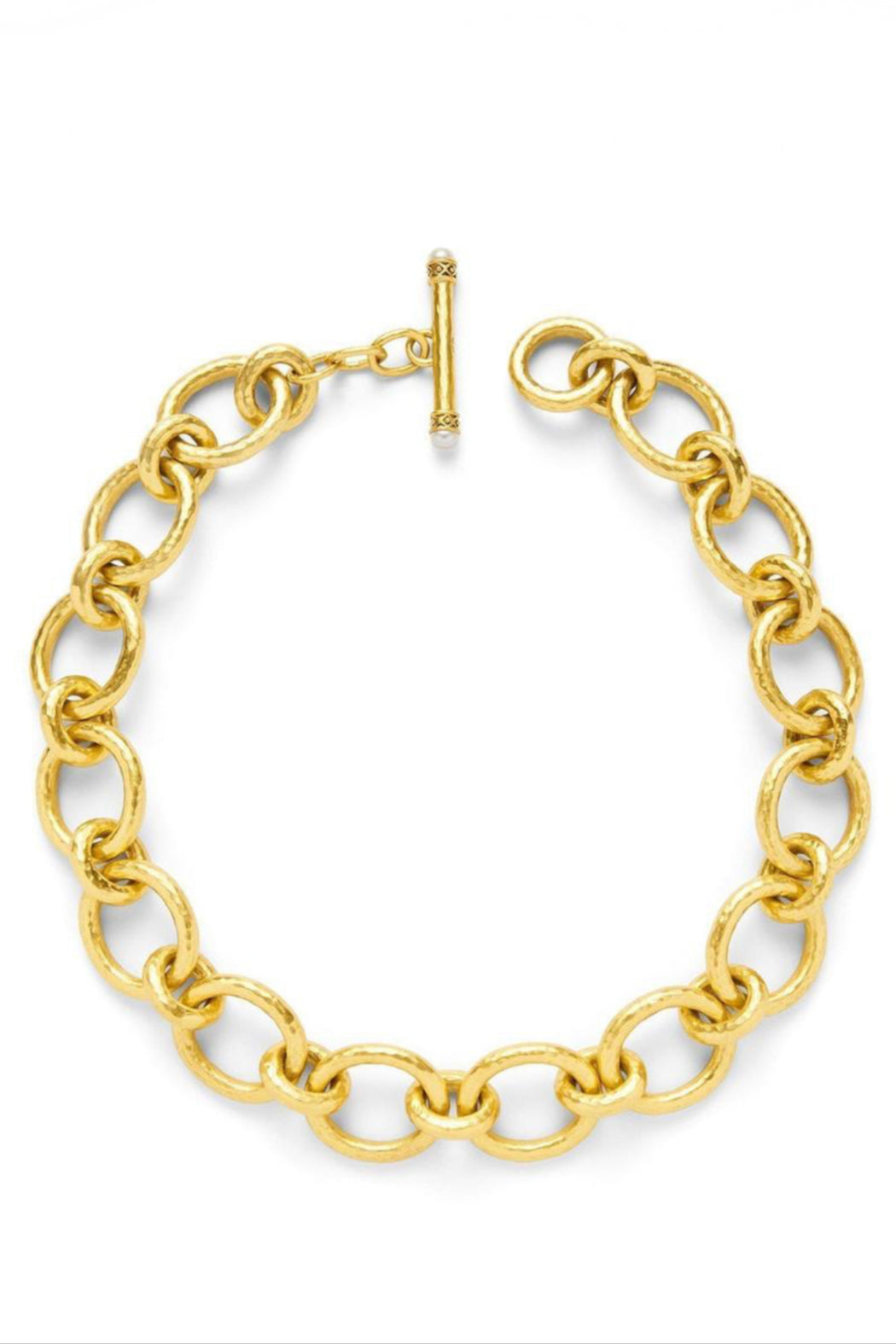 Large link necklace with multi size gold hammered links, and toggle closure with pearl caps.