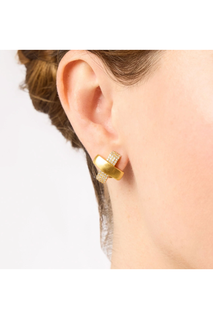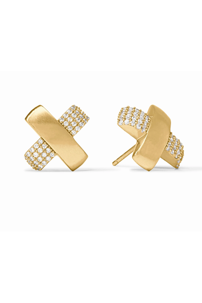 These studs bring a true X-factor, with one golden bar with a smooth satin finish overlapping another encrusted in glittering pavé for a cross between edgy and elegant.