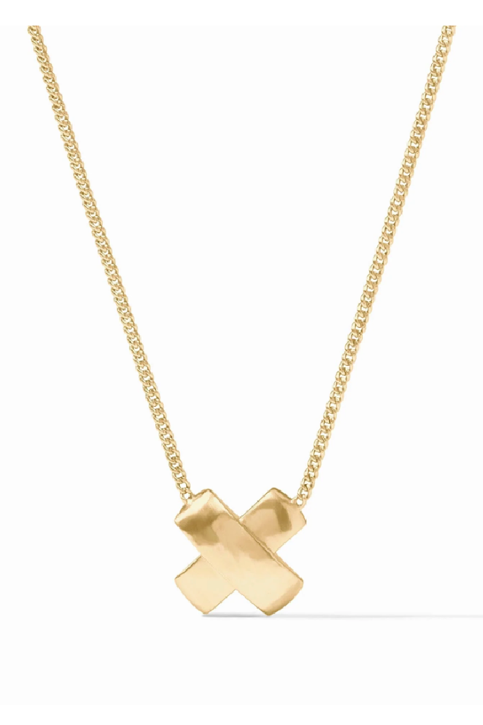 Contrasting textures unite in this X-shaped necklace where one golden bar with a lightly hammered finish overlaps another with a smooth, satiny surface, the pair linked by a delicate adjustable curb chain.