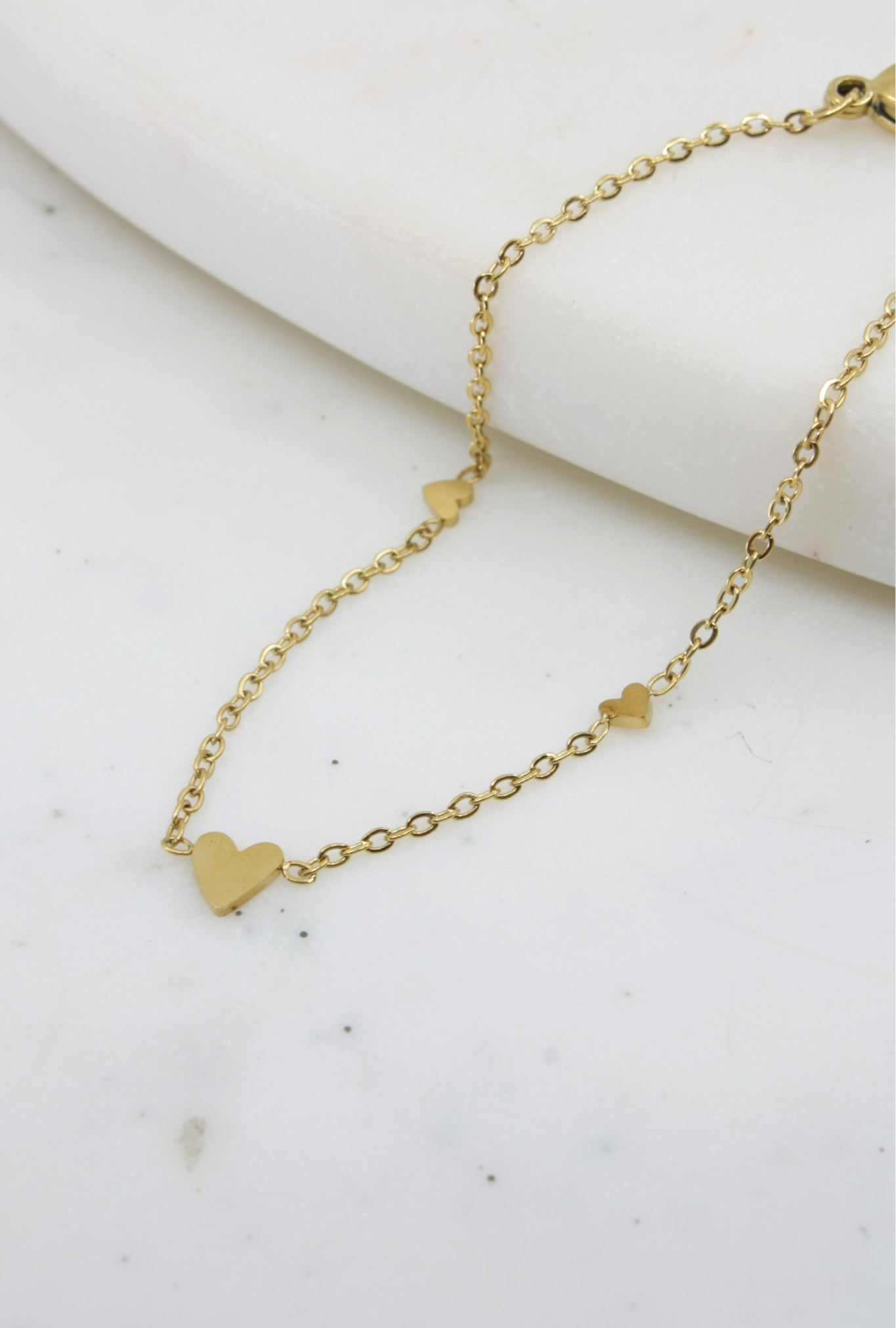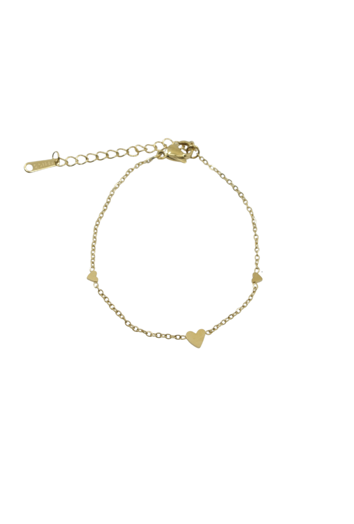 A simple gold chain bracelet with three dainty hearts. Available in gold.