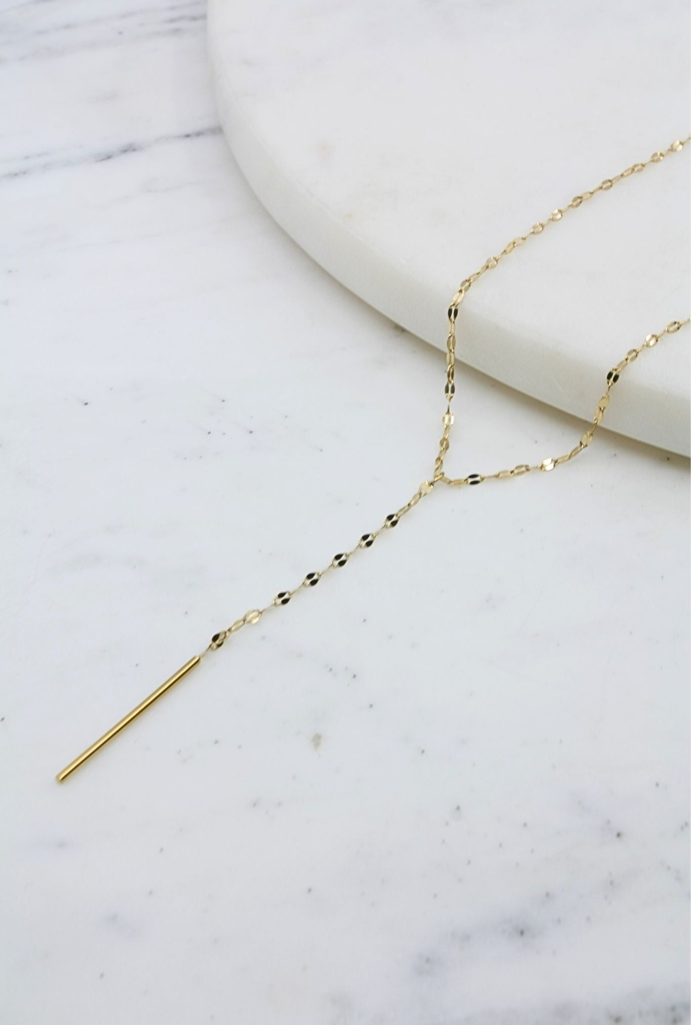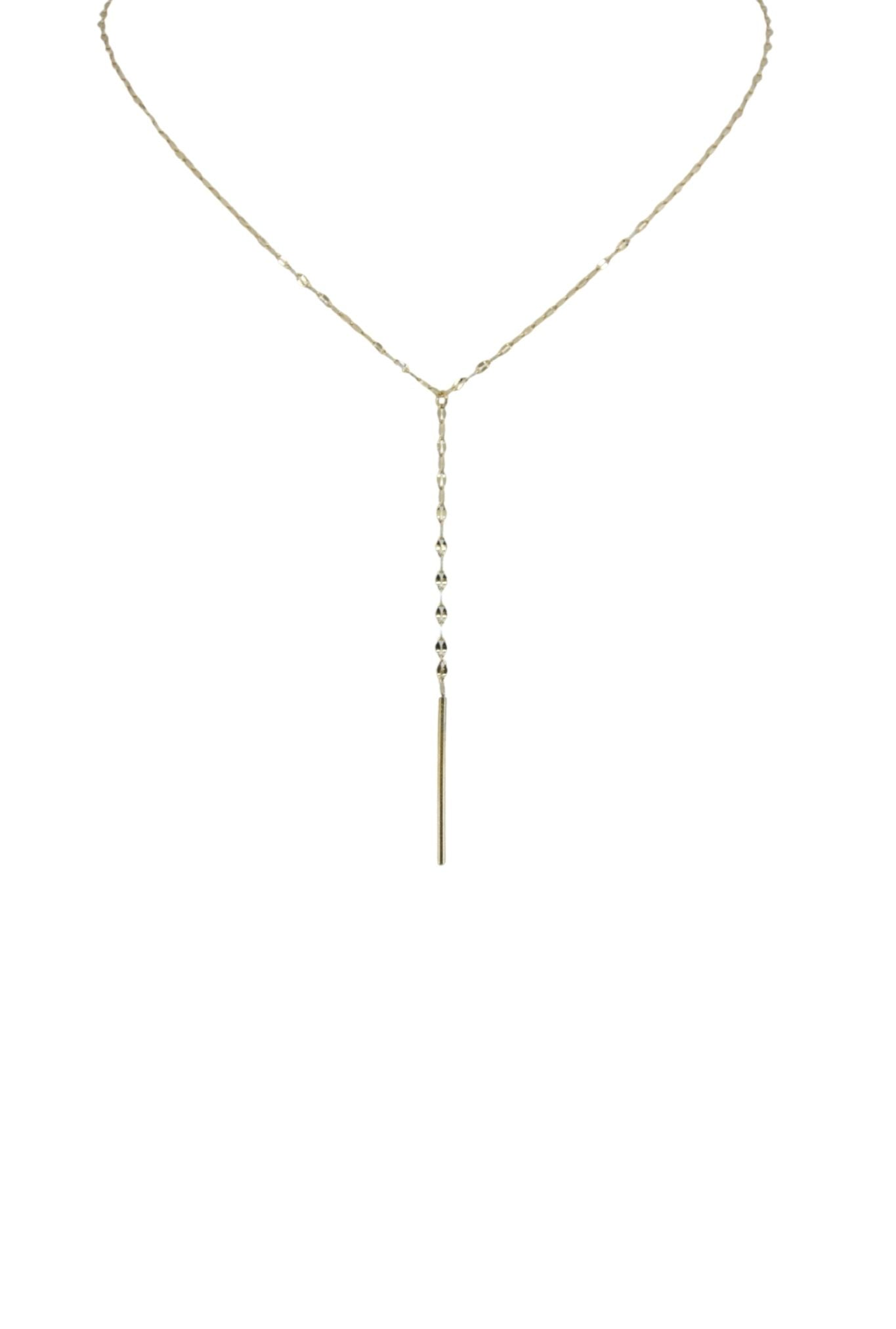 A gold chain tassel necklace with an elegant gold bar drop. Available in gold.